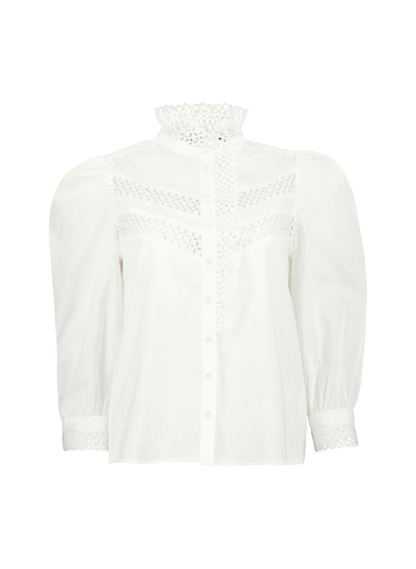 If your weak spot is a romantic, white cotton blouse then prepare to be seduced by Isamaya! This style is loaded with panels of intricate broderie anglaise along the chest, and which also adorns the collar and front opening as a pretty ruffle. Even the cuffs are a moment, with more embroidery detail. Just add jeans for a feelgood, feminine outfit.