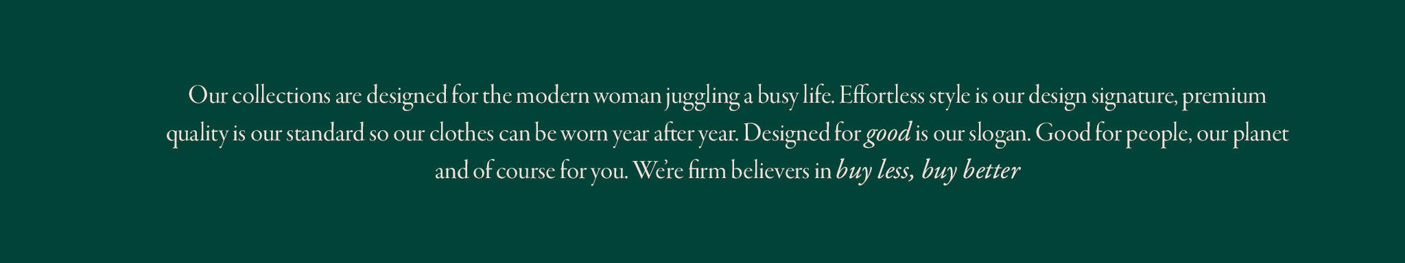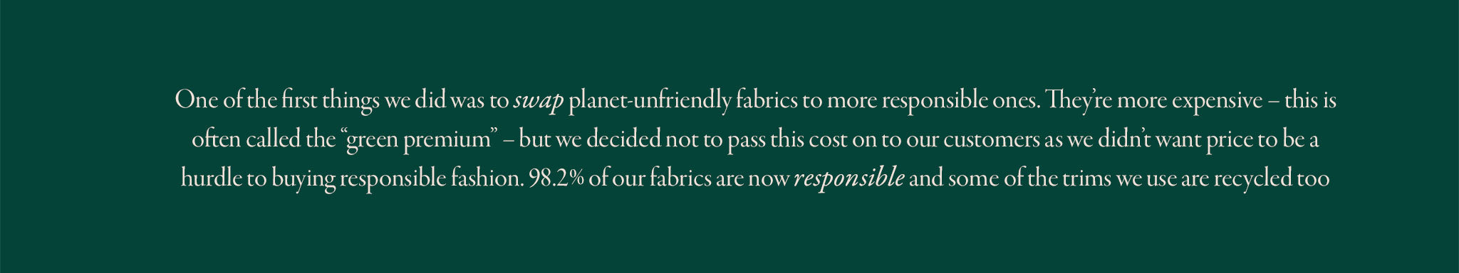 We have always found it important that the people who make our clothes are well paid and work in factories that look after their staff, but it was only years later when we realised the impact the fashion industry has on our planet. It dawned on us that, while we believe in business as a force for good, we were actually participating in one of the planet’s most harmful industries. That was never our plan. So, we decided to do everything we could to make a positive difference, not just with our brands but for the whole fashion sector as well. You can read more here. We didn’t do this alone of course, the team and our suppliers have been involved all the way