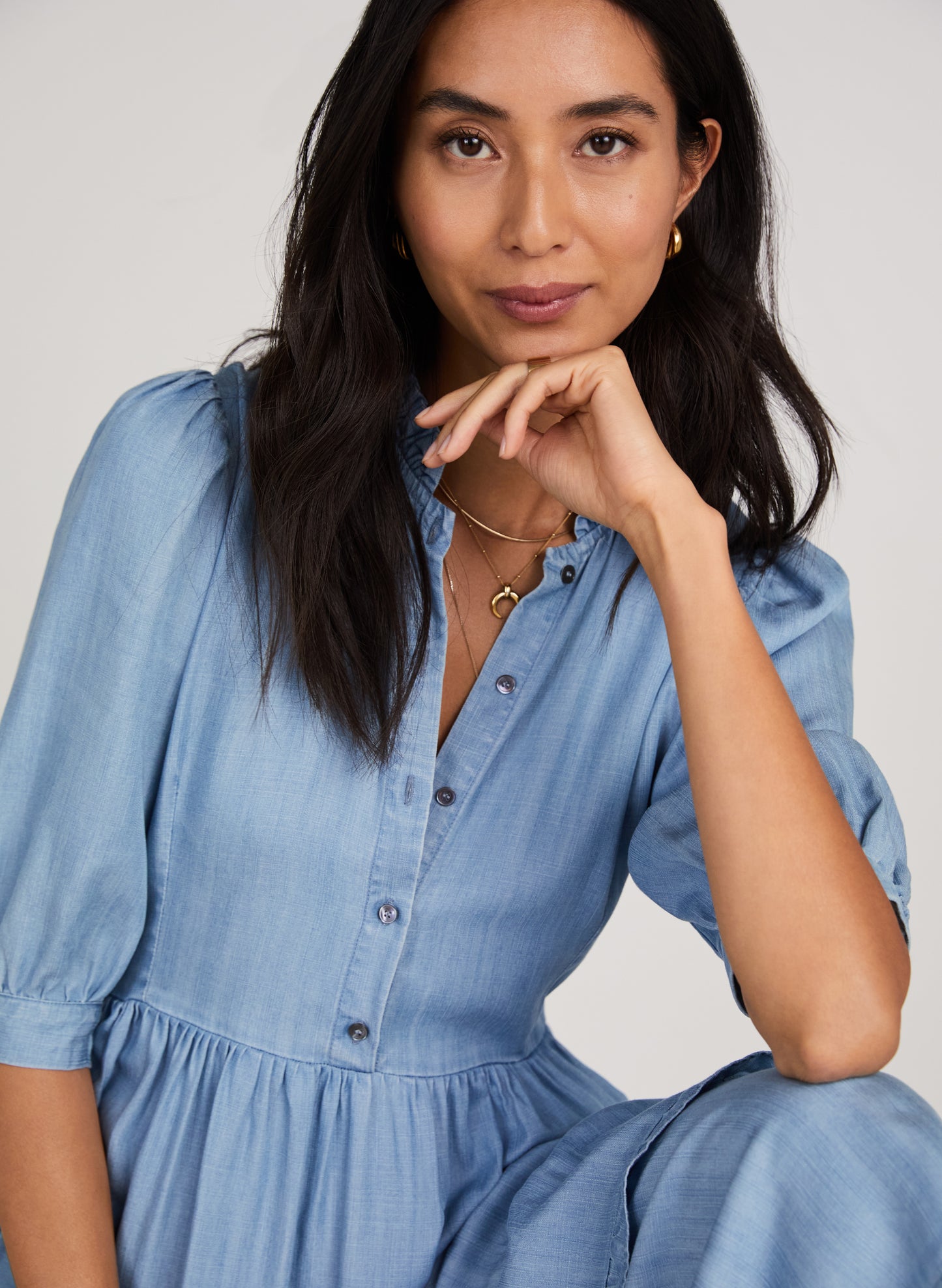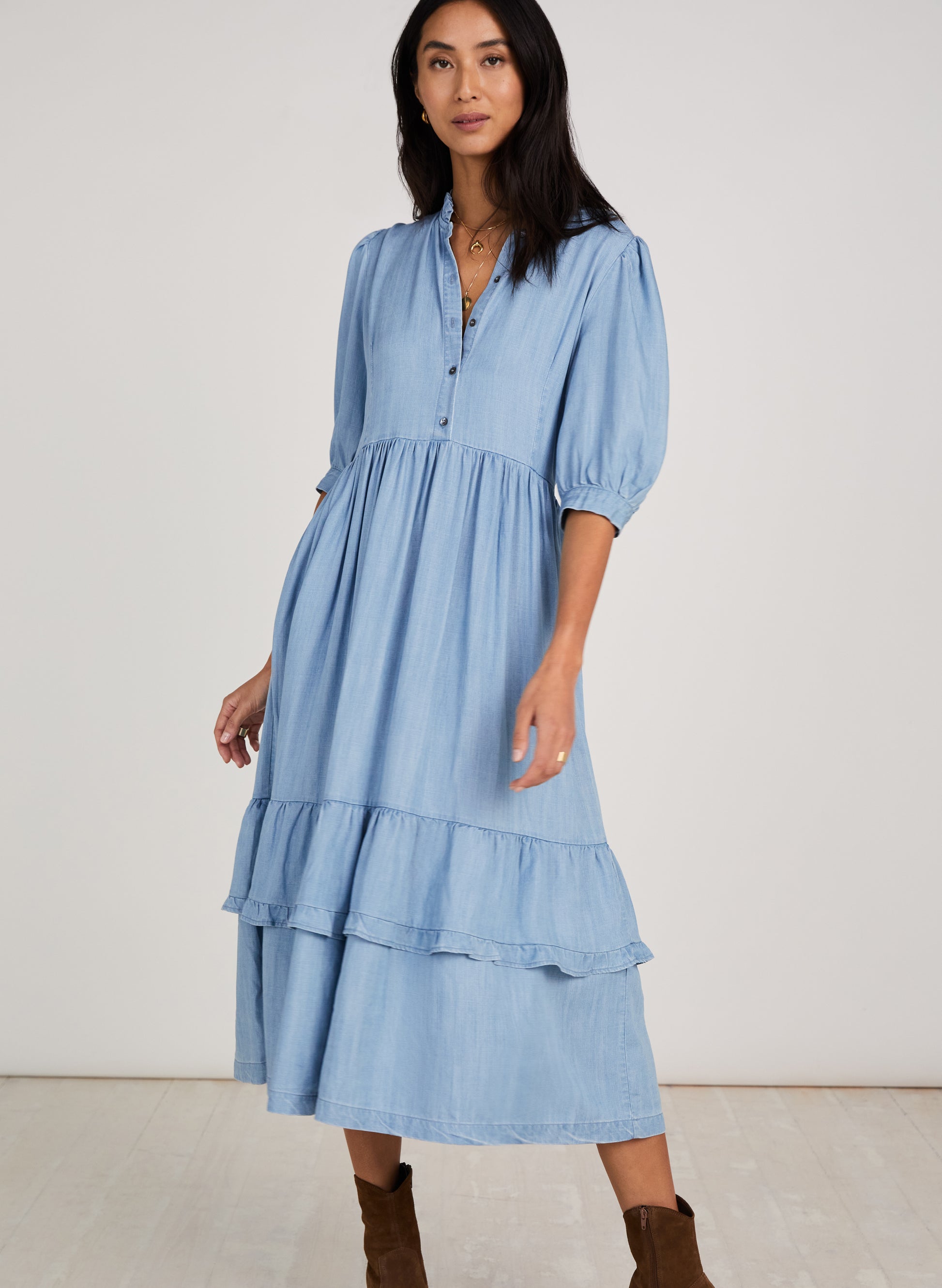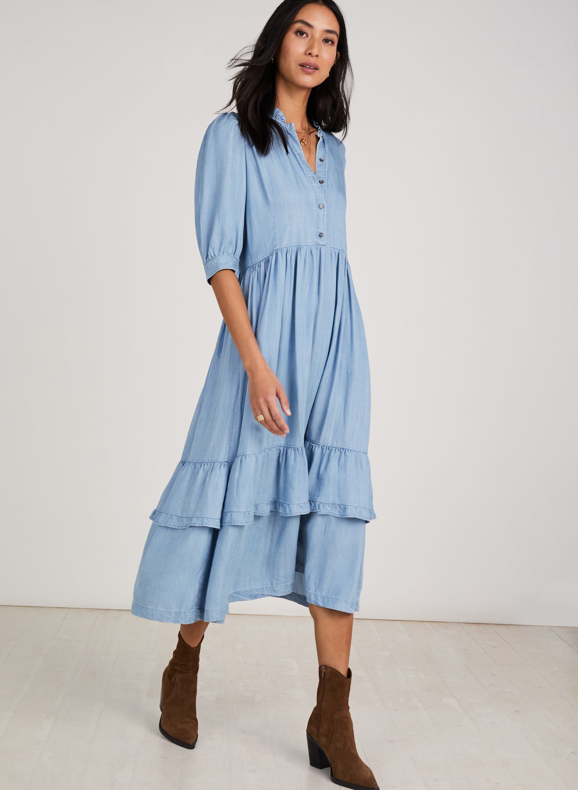 The calf-grazing Alicia dress taps into the prairie trend - a feminine take on dressing that we love. Made from organic cotton chambray, it looks like denim but is softer (and kinder to the planet). It buttons down to the waist and flares into a generous skirt with a frill-edged tier. It goes with loafers as pictured here but looks just as cool with chunky ankle boots or sandals when the weather warms up.
