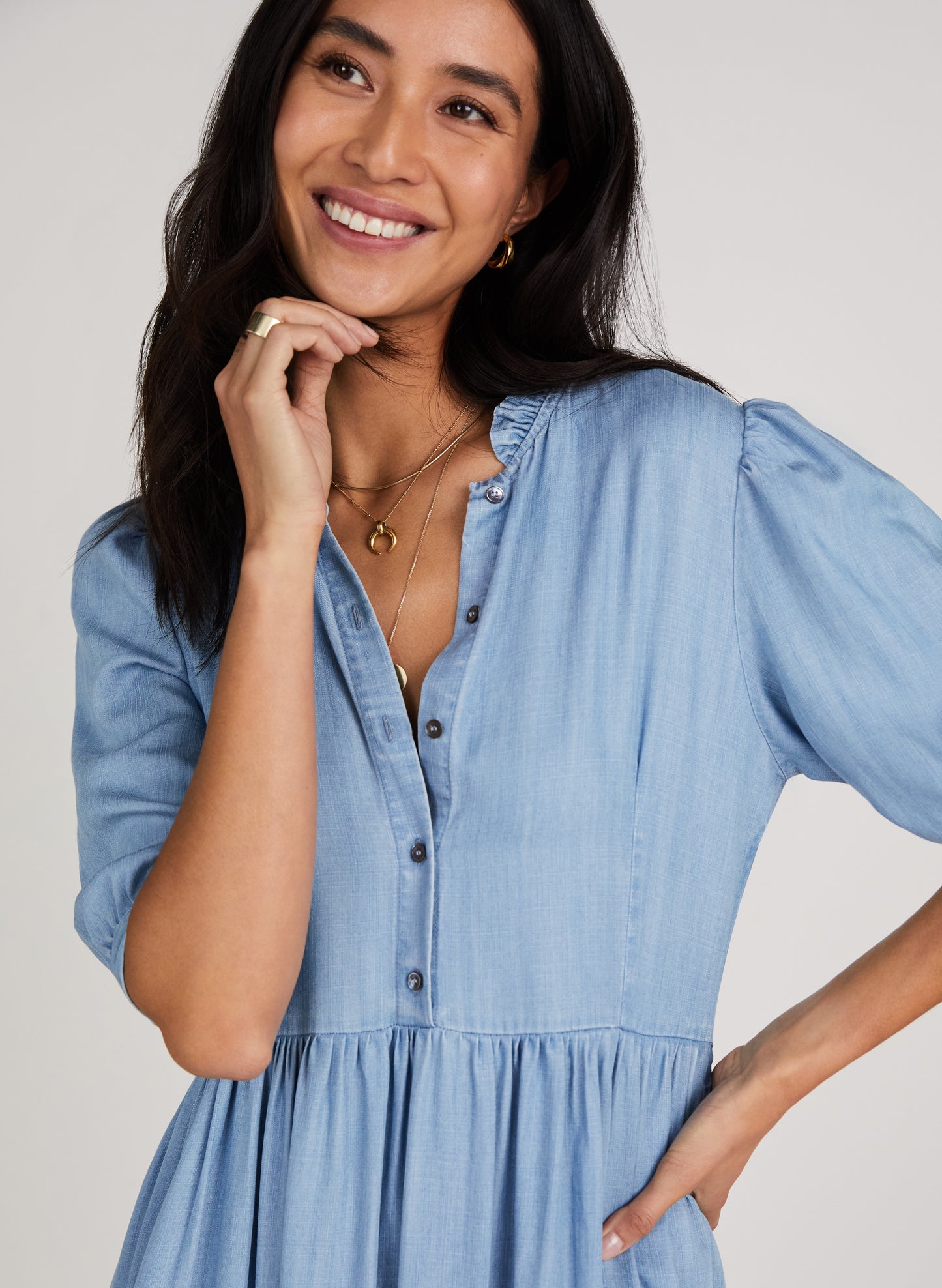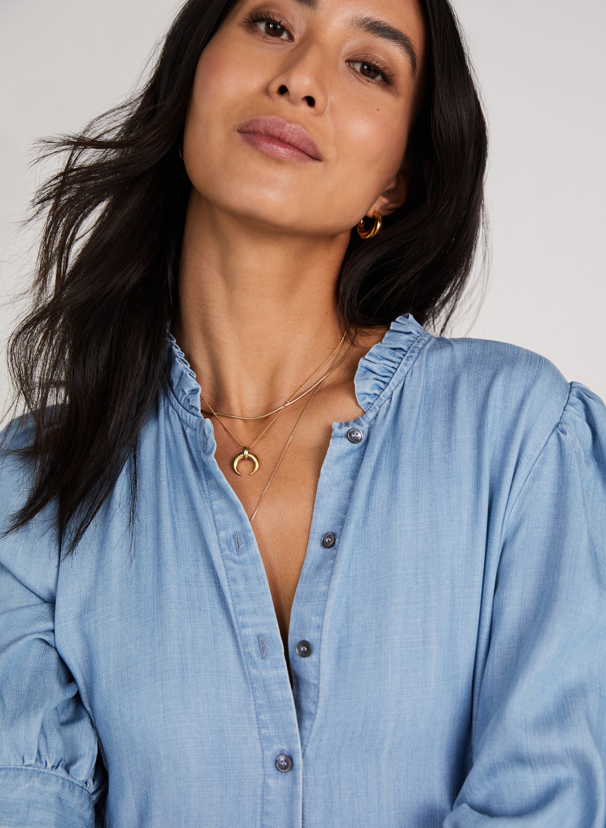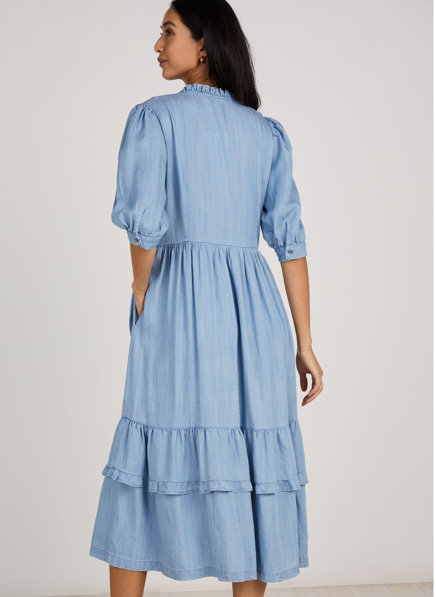 The calf-grazing Alicia dress taps into the prairie trend - a feminine take on dressing that we love. Made from organic cotton chambray, it looks like denim but is softer (and kinder to the planet). It buttons down to the waist and flares into a generous skirt with a frill-edged tier. It goes with loafers as pictured here but looks just as cool with chunky ankle boots or sandals when the weather warms up.