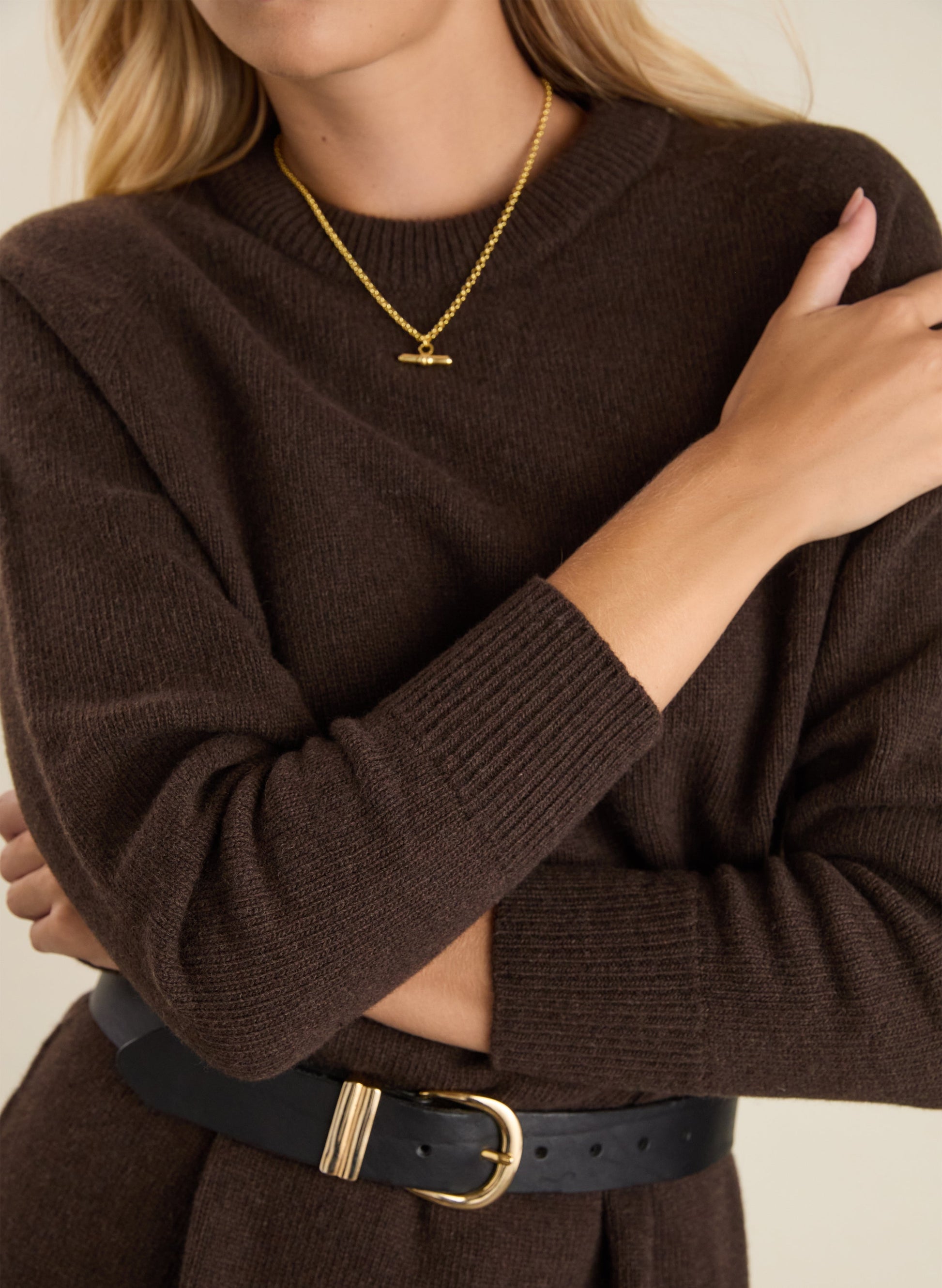 For a cosy and easy outfit, look no further than the Alison Knitted Dress. Taking the hassle out of putting together outfits in cold weather, it is crafted in a midweight, recycled wool blend with side splits around the ribbed hem for ease of movement. It comes in a relaxed column shape and a midi length that is perfect for styling with boots and tights.