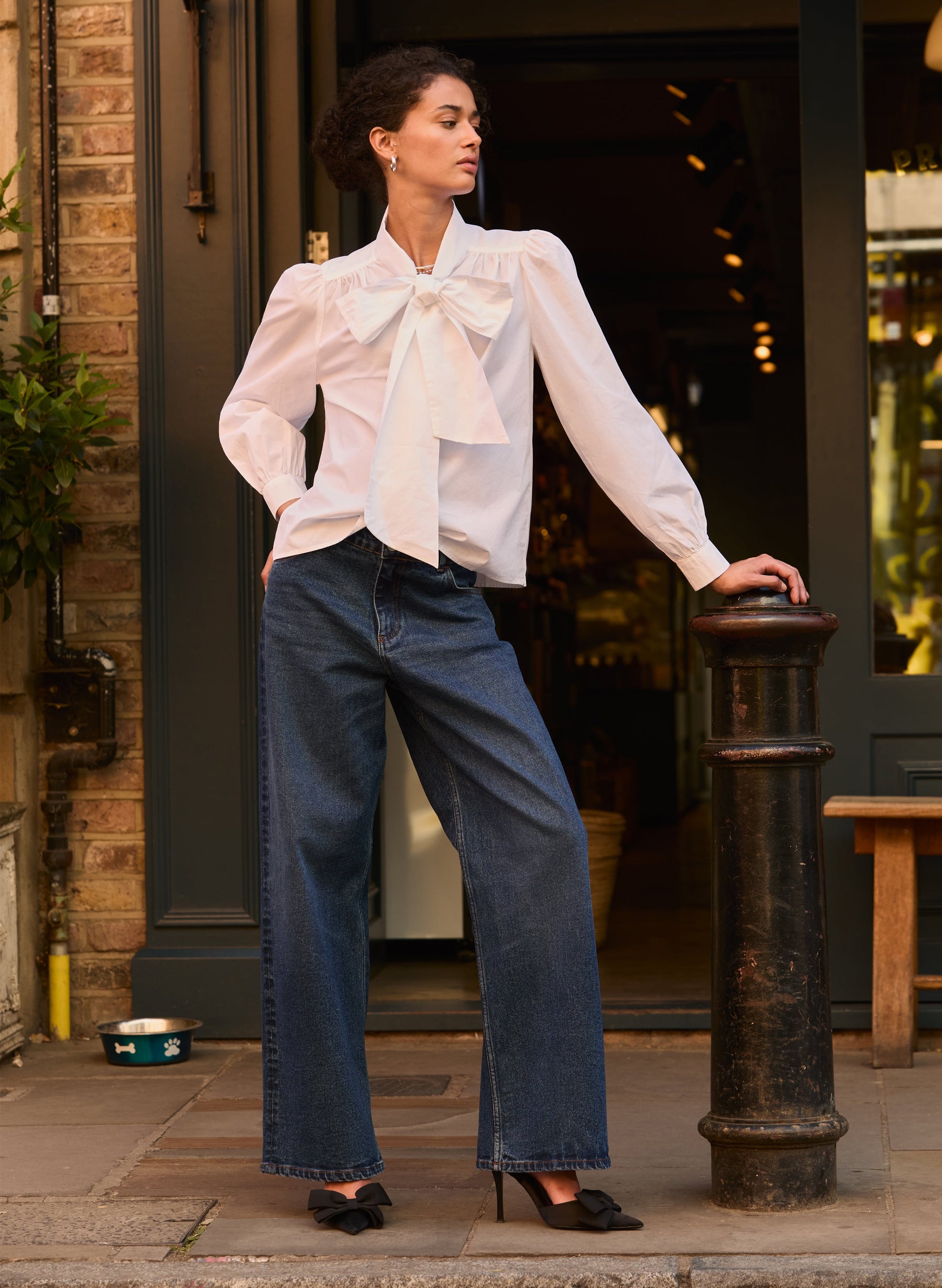 Say hello to a shirt with a difference! The Araya Blouse makes a bold statement with an oversize pussy-bow. Crafted in organic cotton poplin throughout, the extended tie feature can be played around with. Crisp and cool, this top will add a new dimension to trousers for the office, as well as updating jeans in one simple move.