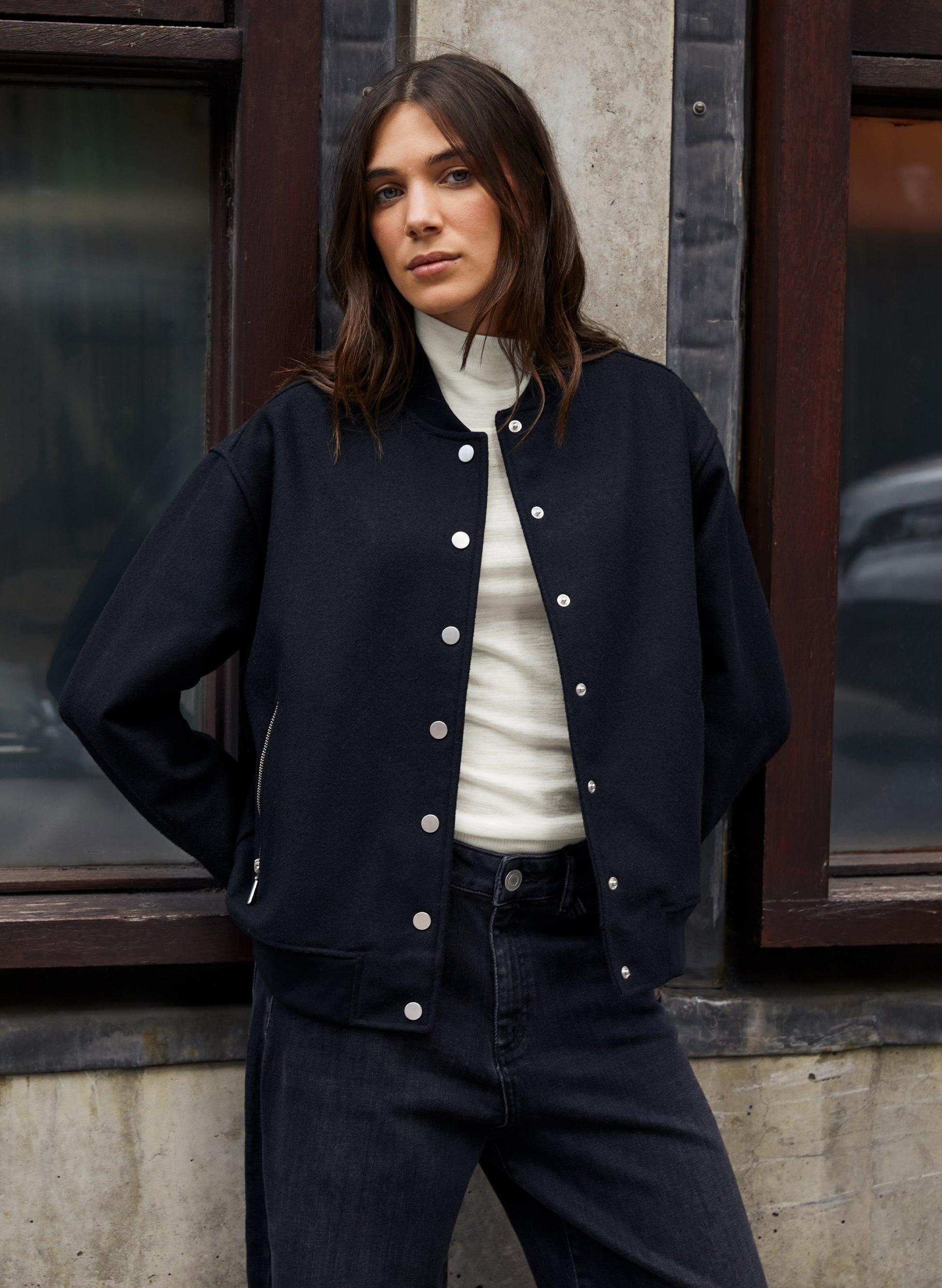 - Fine rib detail along hem and cuffs