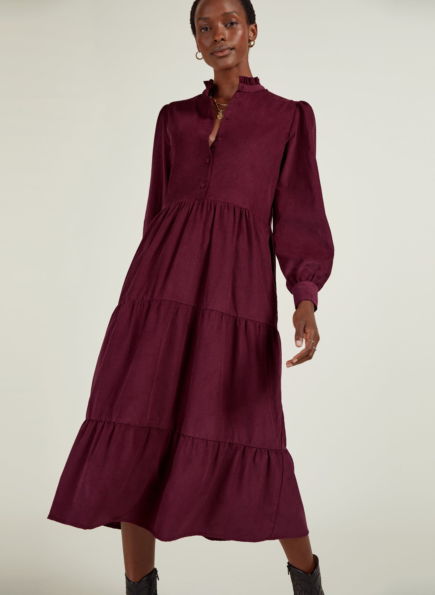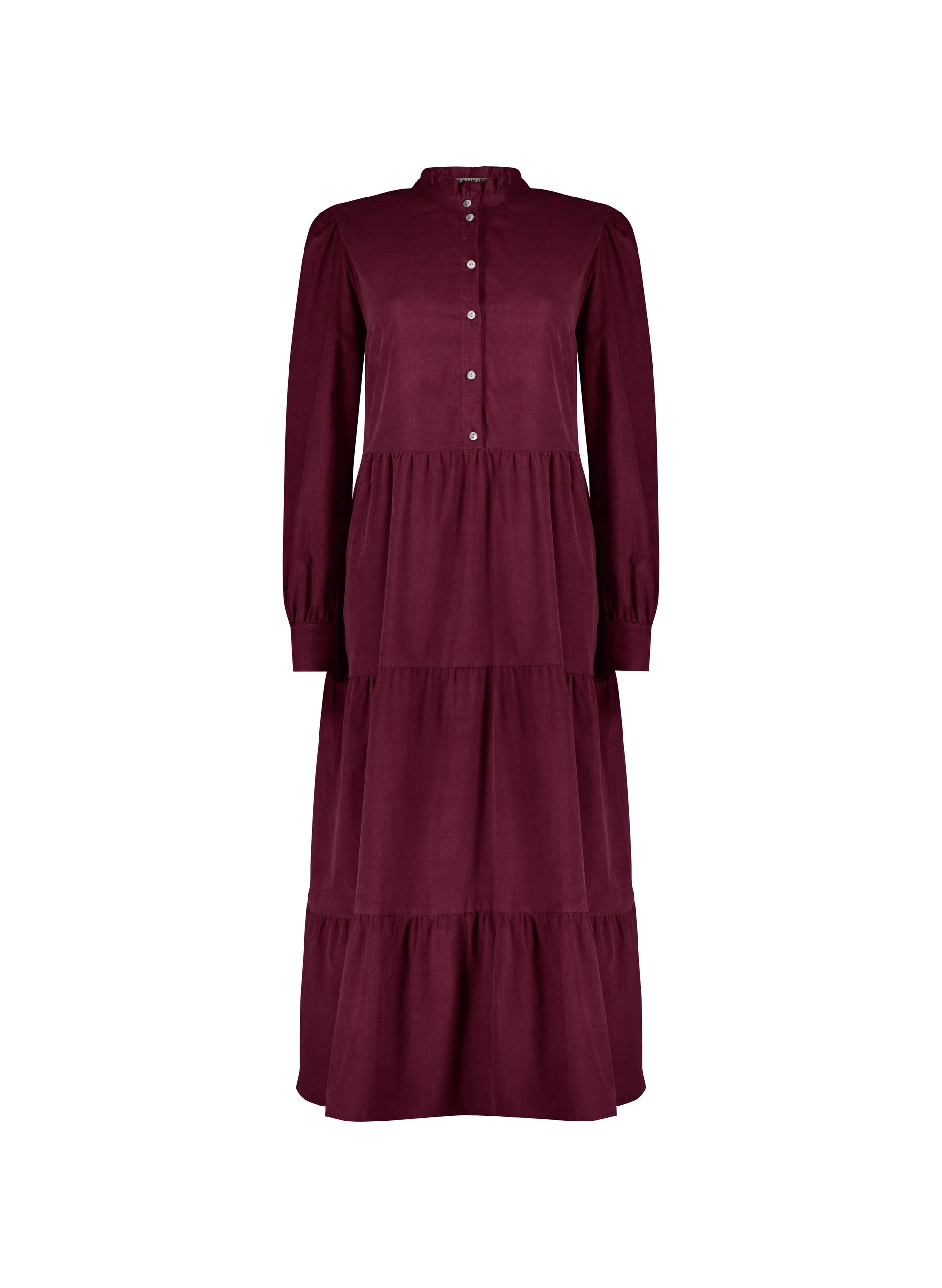 The Cadie in burgundy is exactly what you’ll want to wear for autumnal walks and cosy pub lunches. Its Victoriana-style ruffled collar and gathered shoulders make it unapologetically feminine, but its loose tiered skirt guarantees easy comfort. It is crafted from organic fine corduroy, so expect a rich texture and a new partner in crime for your favourite ankle boots.