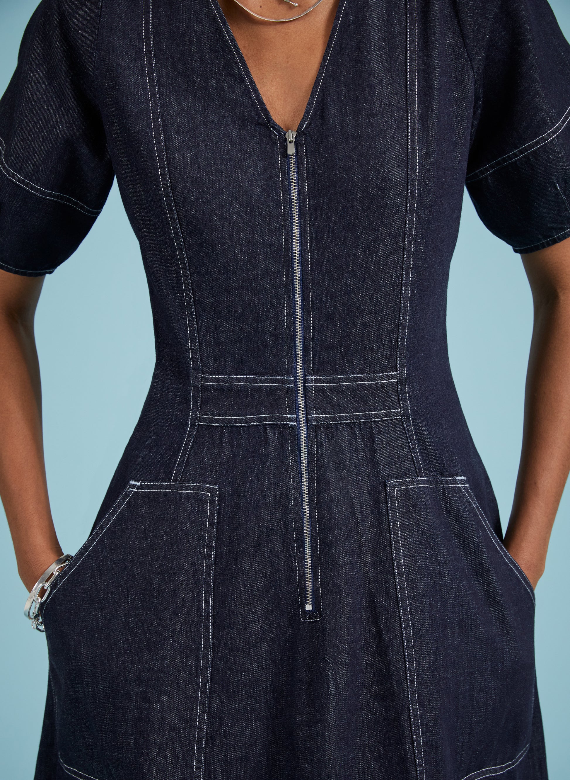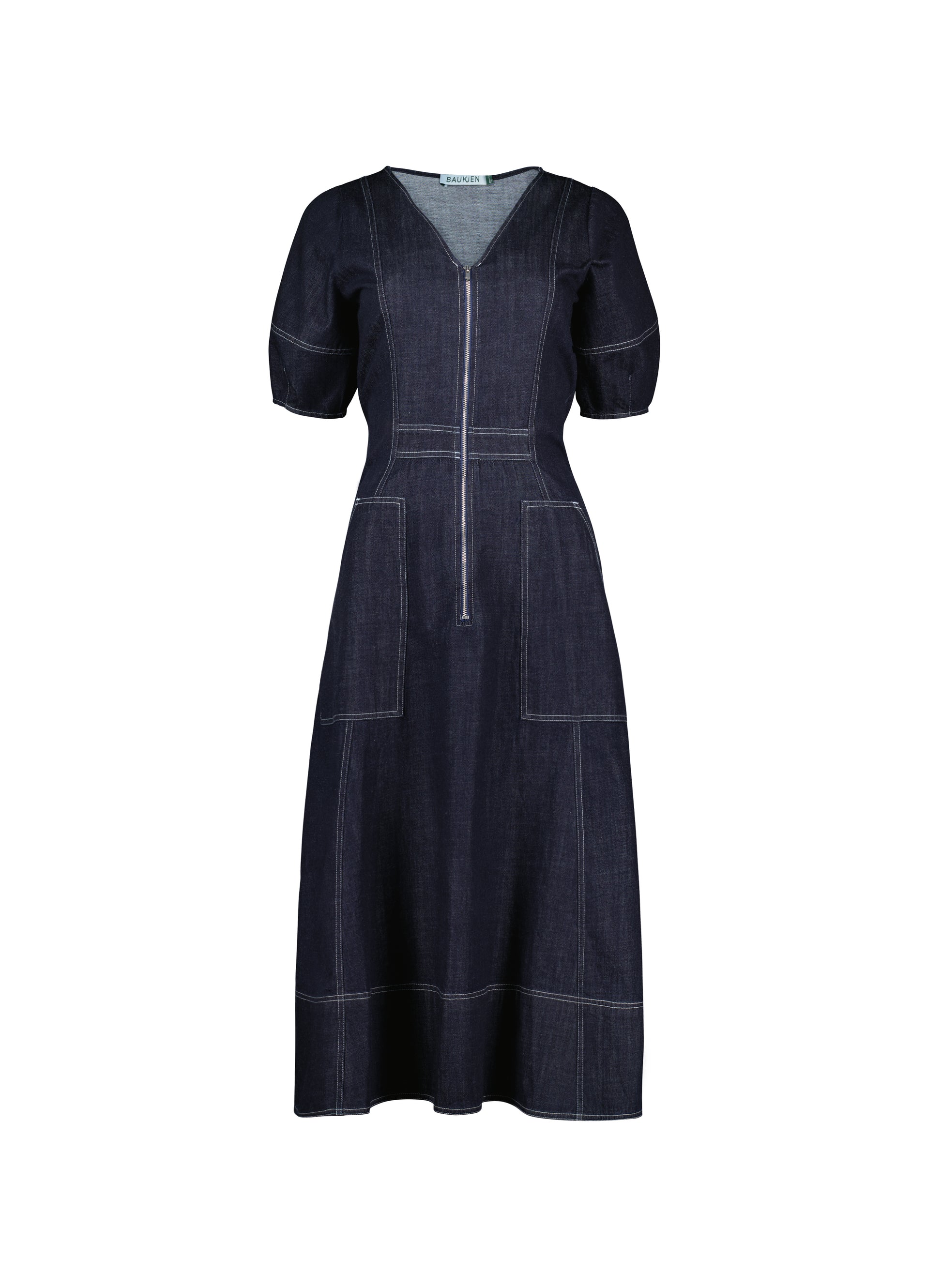 Coralie is a denim dress you can wear year-round: style it with bare legs and ballet pumps on milder days, then layer it with knee-high boots and a rollneck come winter. Crafted in raw, organic denim and defined by contrast stitching. An elasticated back panel is cut for a waist-accentuating fit and flare shape. Voluminous bell sleeves, and front zip opening top this contemporary design off.