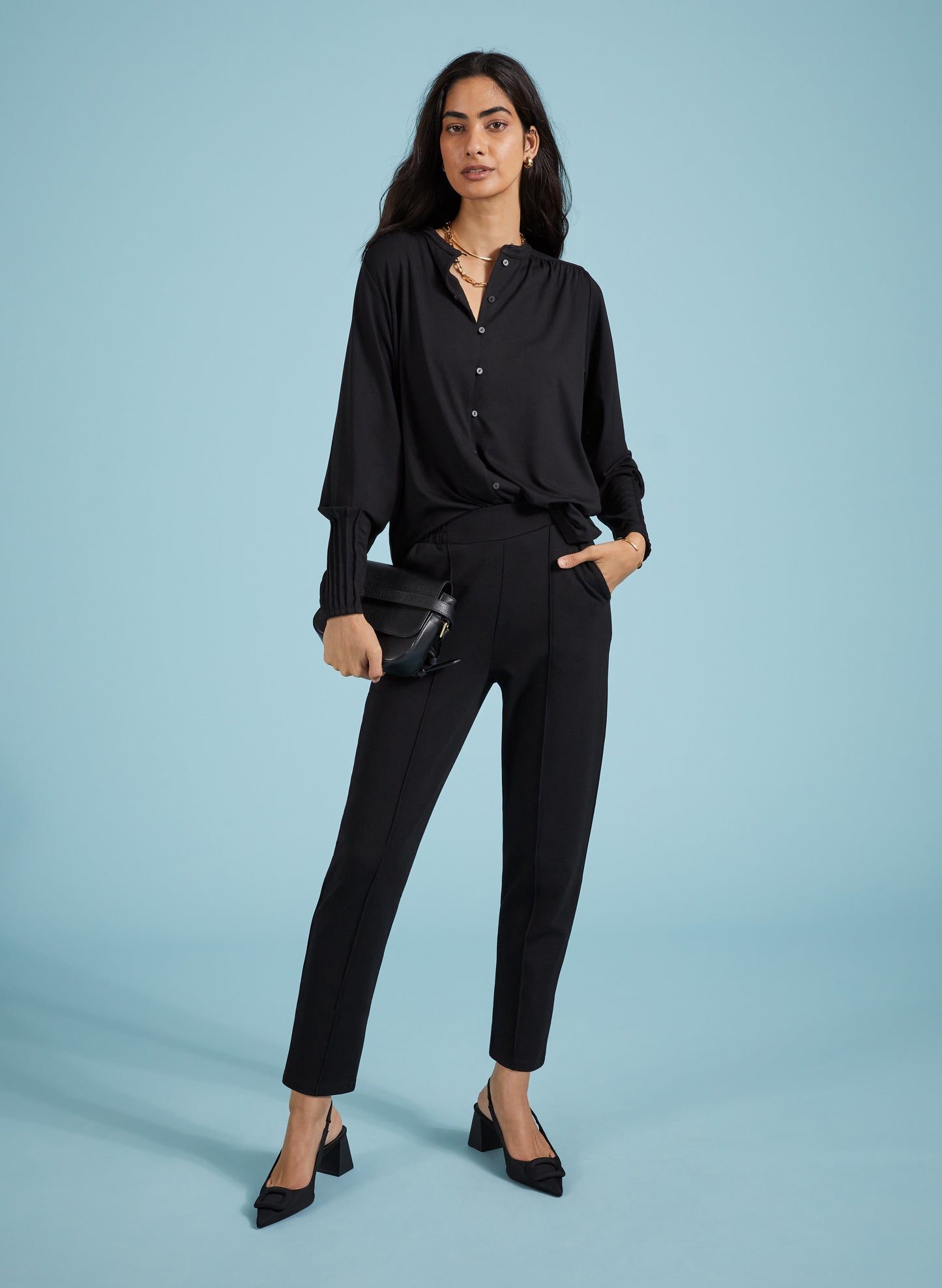 The search for ridiculously comfortable, tailored black trousers ends here. The Elizabeth are crafted from heavyweight jersey ponte - which gives a smart and structured look - but the stretchiness of this fabric and the elasticated waist makes them a joy to wear. The slim shape and pintuck detail down each leg makes them perfect for the office - style with the co-ordinating Alanis Jacket for the ultimate weekday uniform.