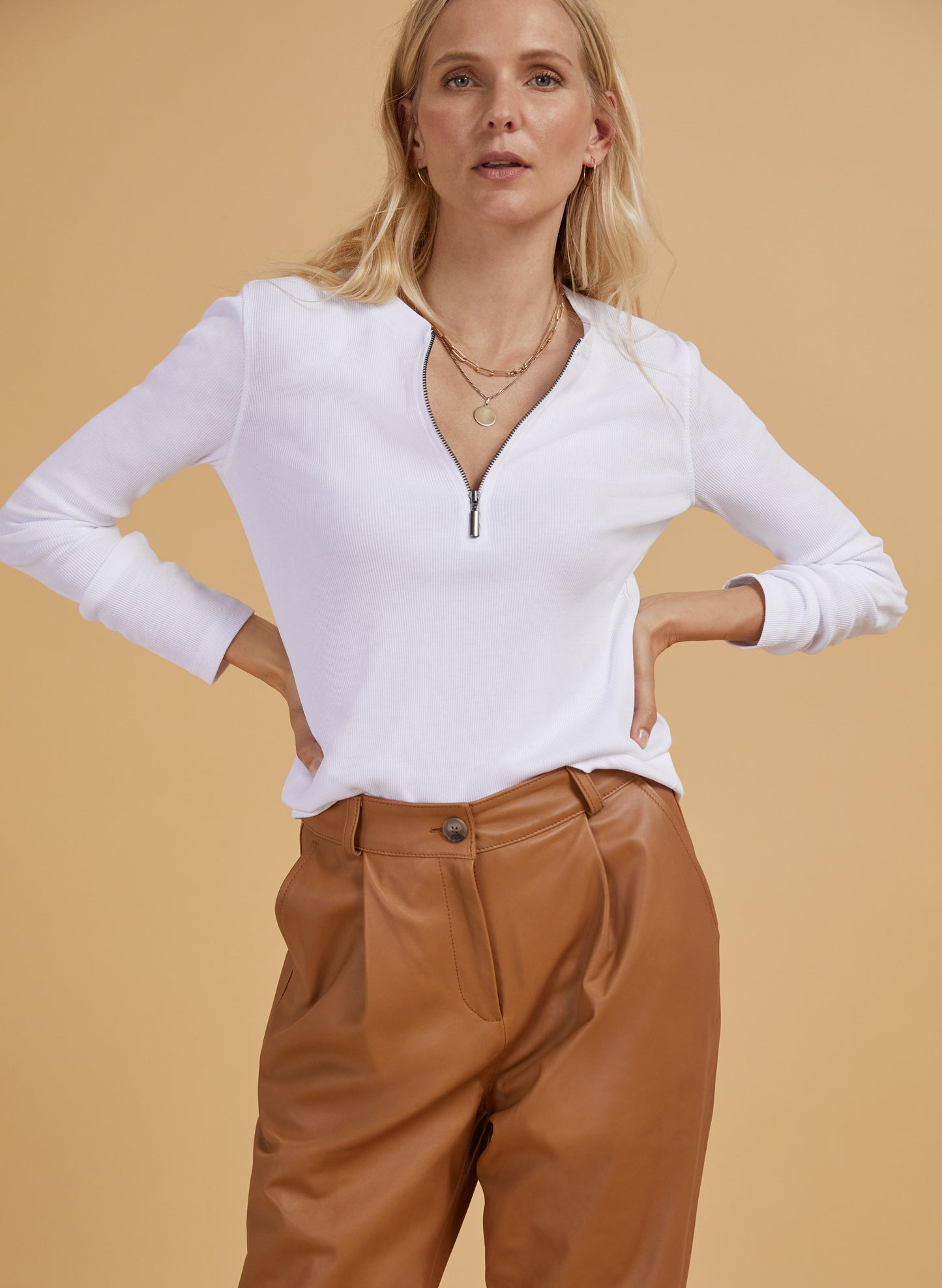 We’ve reimagined the classic, carrot-leg trouser in butter-soft European leather and a choice of neutral colourways. Dressed up with blouses and loafers or down with sneakers and sweats, they’ll lend a sophisticated twist to any look. The Faiza feature a pleat detail around the high-rise waist, pockets and fasten with a zip and a button. It’s crafted from premium European leather and made in a family run atelier in Portugal.