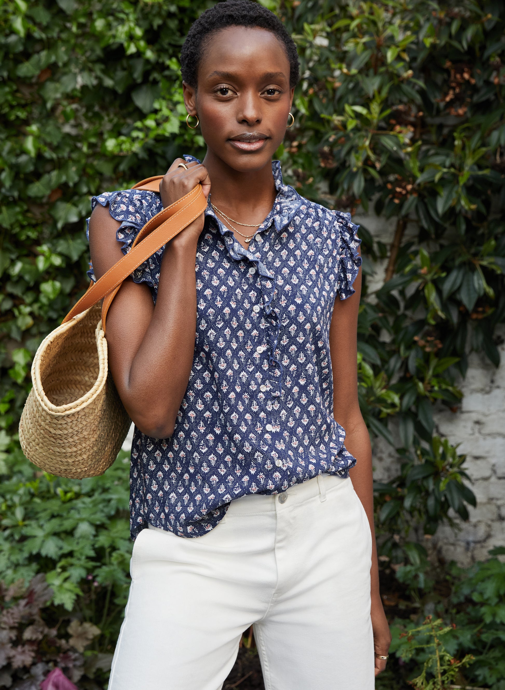 This chic top bears the same woodblock-inspired print as our beautiful Sarai Dress. As well as dressing it up with tailored trousers, you can style it casually with chinos or jeans. Look closely and you’ll see that the flutter sleeves, frill collar and demi-placket are edged with a navy overlock for that extra detail.