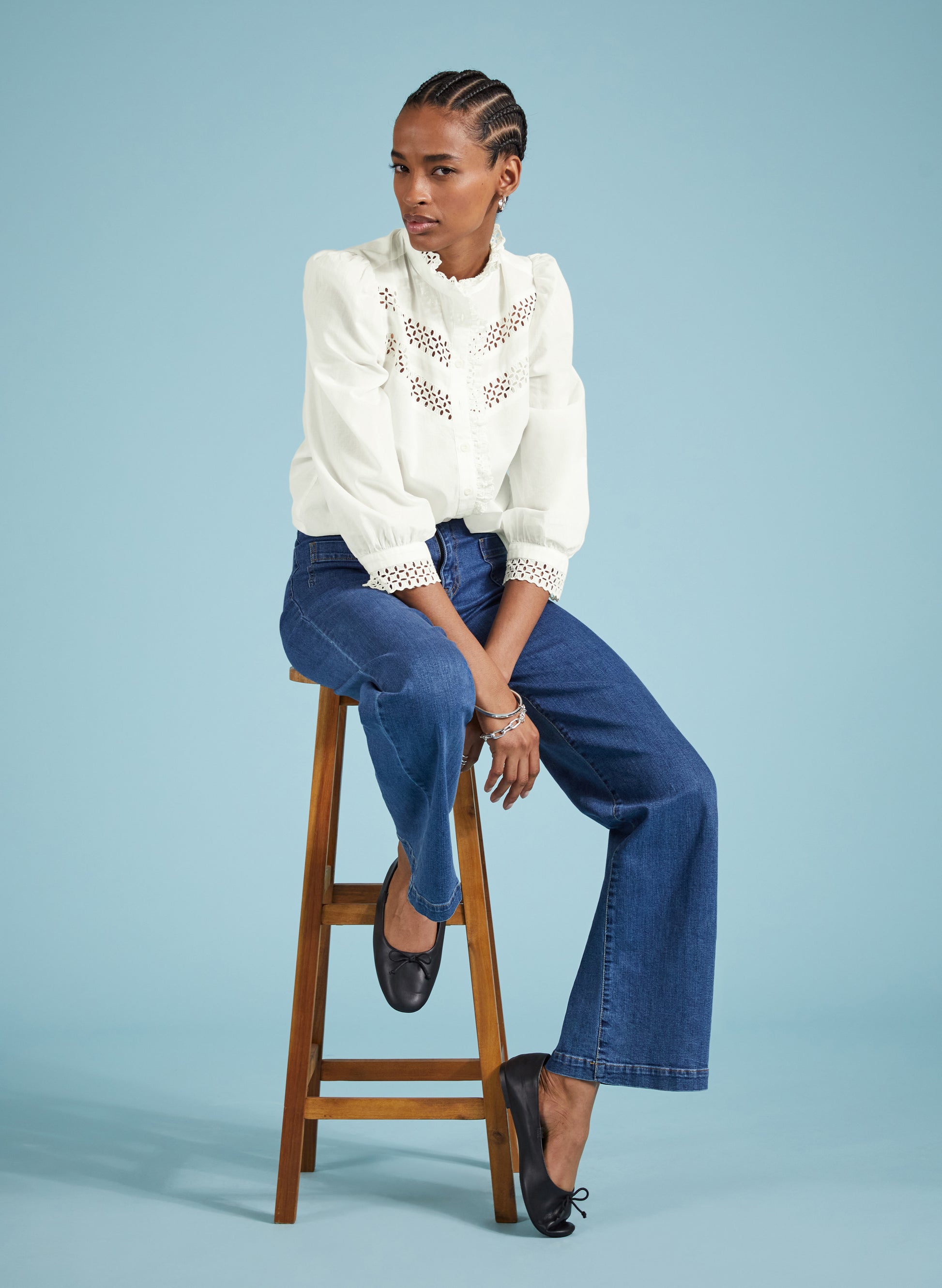 If your weak spot is a romantic, white cotton blouse then prepare to be seduced by Isamaya! This style is loaded with panels of intricate broderie anglaise along the chest, and which also adorns the collar and front opening as a pretty ruffle. Even the cuffs are a moment, with more embroidery detail. Just add jeans for a feelgood, feminine outfit.
