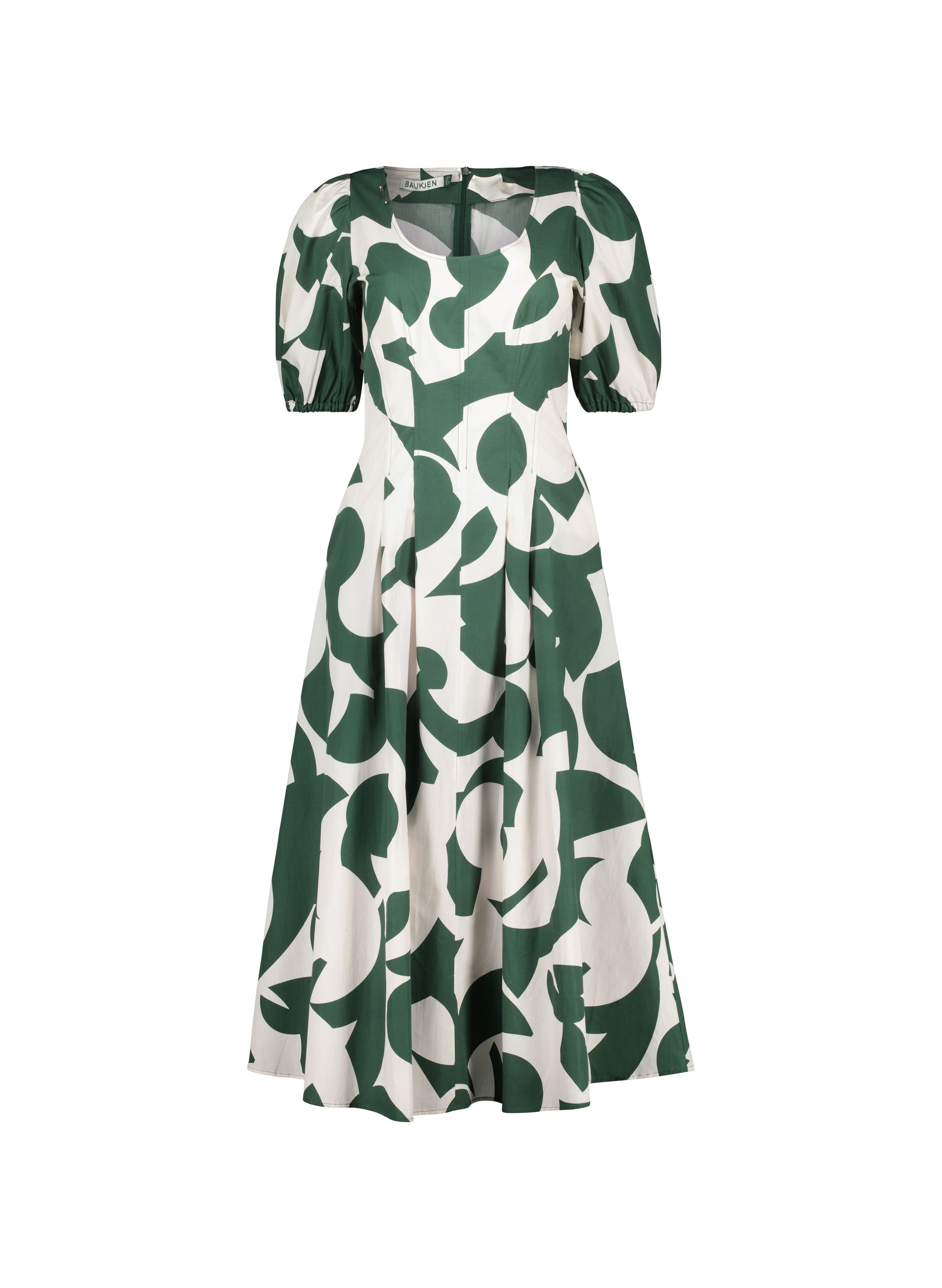 Our Design Director Natalie’s favourite dress of the season, this dress boasts a beautiful cut and a statement pattern. Its abstract print in dark green on crisp, organic cotton is cut into an hourglass shape with beautiful pleated detailing around the waist, and generously puffed sleeves. An impactful choice for special events, it has a squared scoop neckline and a generous skirt that is perfect for swishing around in.
