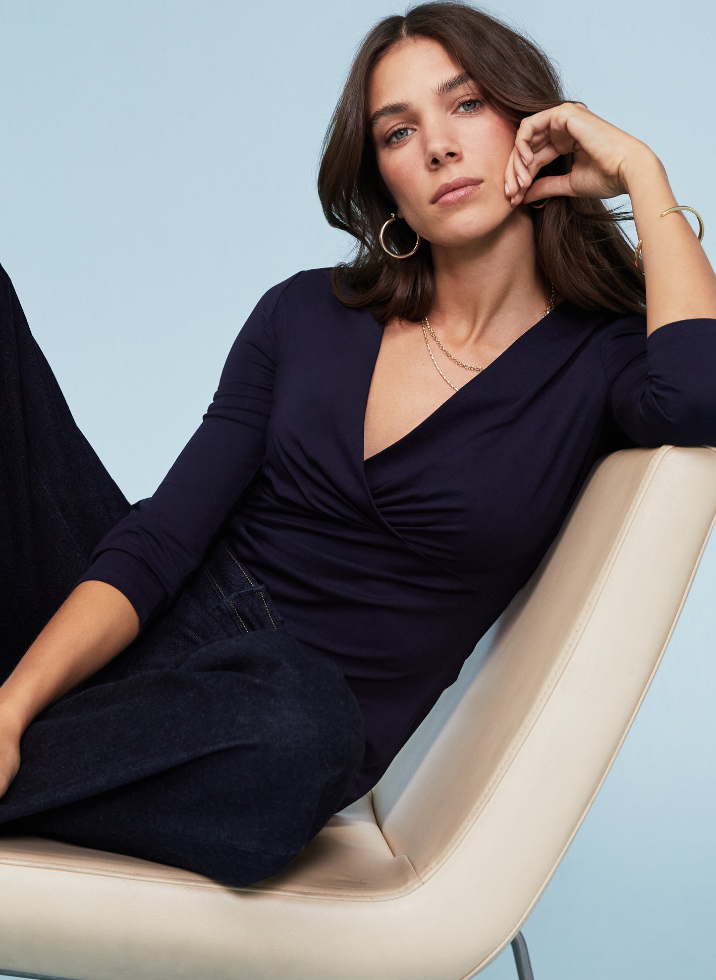 A little black top will get you out of an I’ve-got-nothing-smart-to-wear predicament in one easy move. Juliette is made from responsibly-sourced jersey, so comfort is key, but its fixed wrap neckline will elevate a pair of jeans or tailored trousers effortlessly. Its v-shape neckline is so flattering - simply add a necklace.