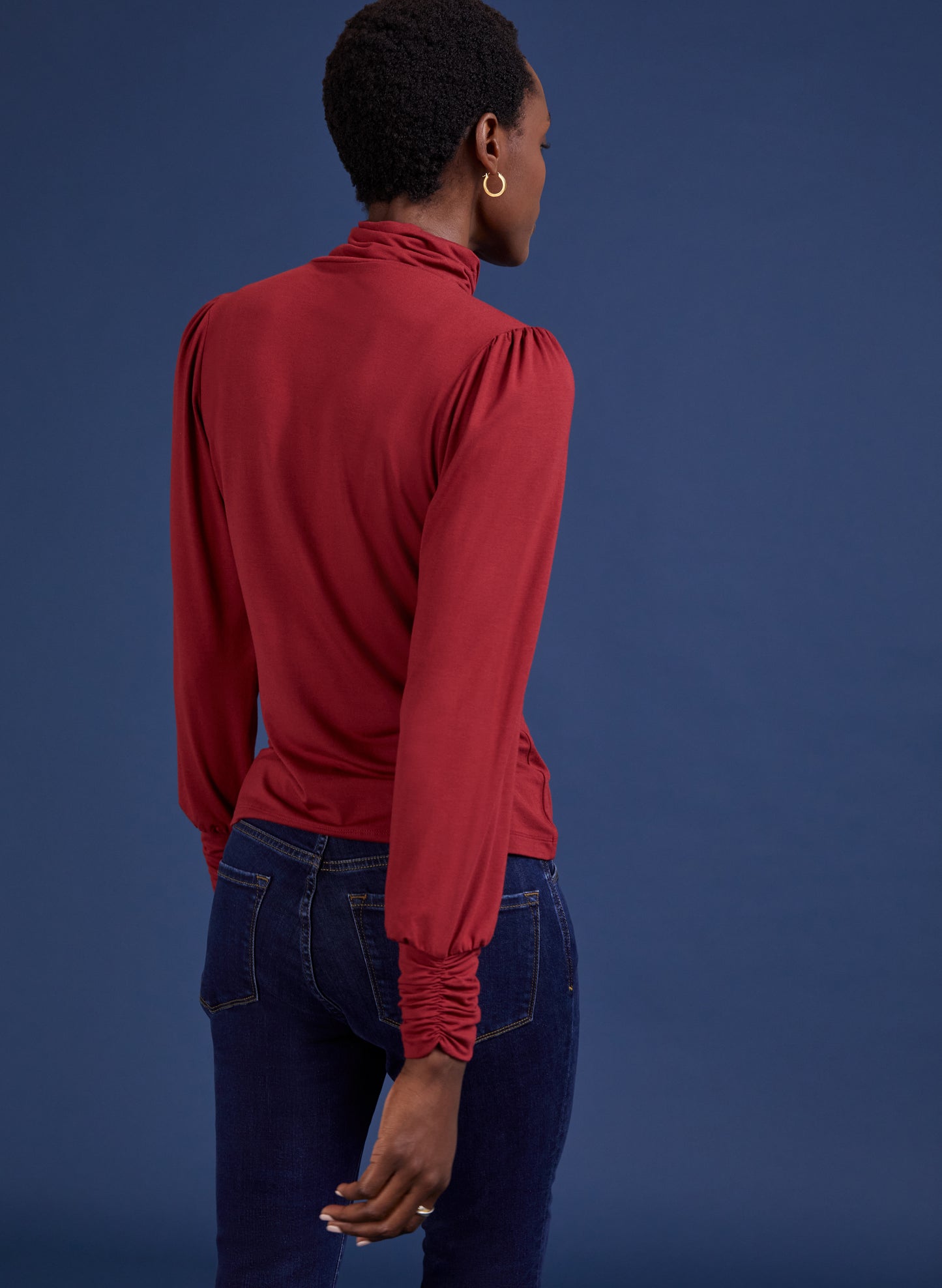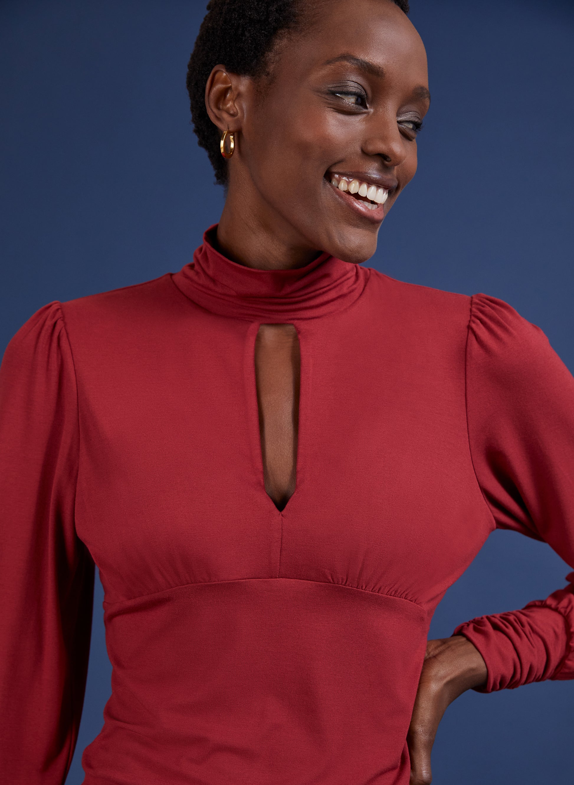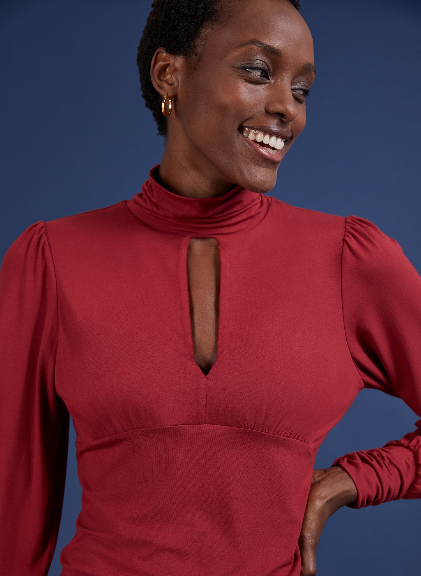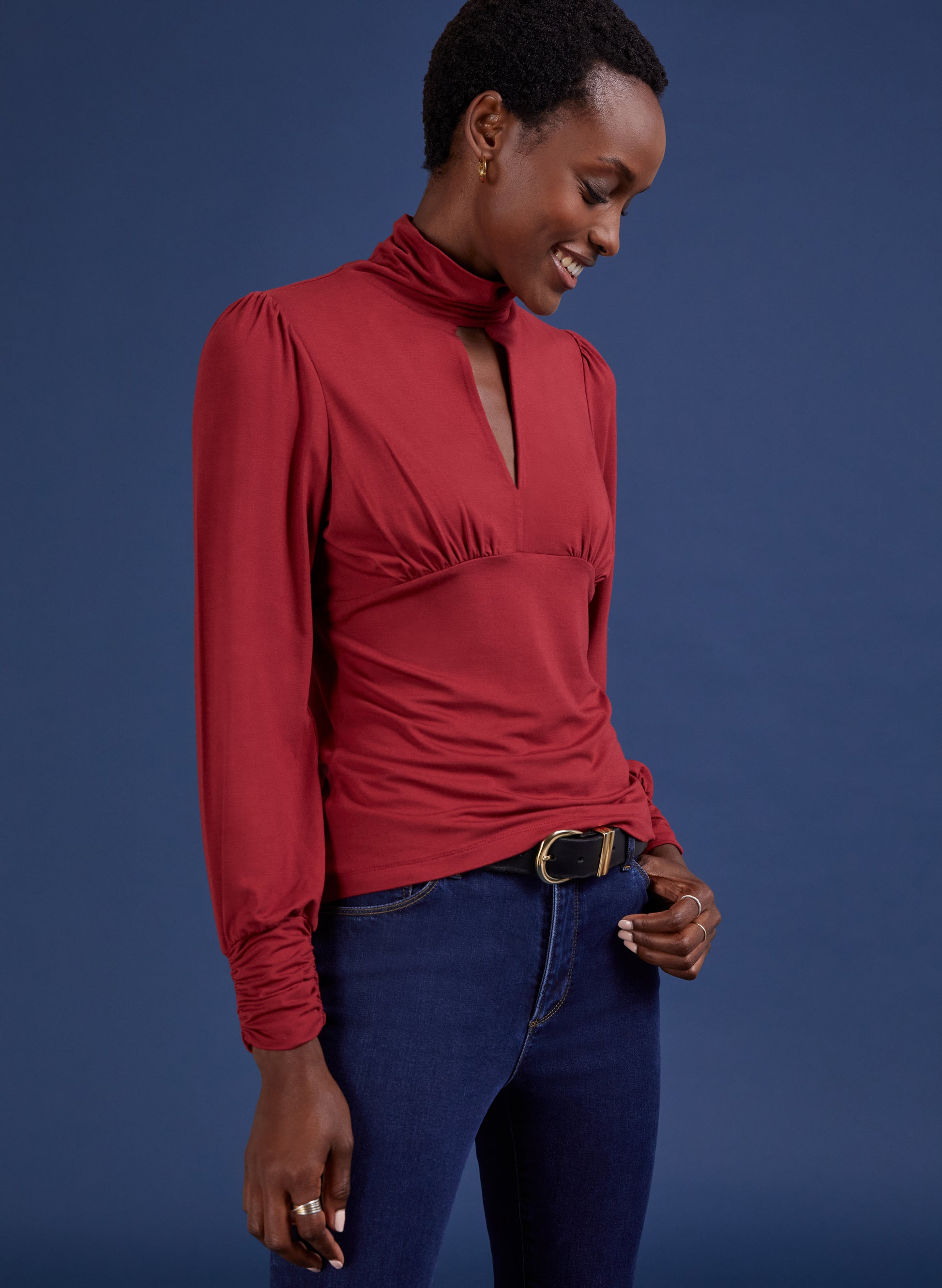 Bring a little 70s glamour to your going-out wardrobe with Lizzie. This desirable style’s sensual front split is offset with a high neckline and elegant blouson sleeves, which finish with beautifully ruched cuffs. Cut to skim the waist with a gathered, under-the-bust seam, this elevated jersey style goes as well with smart jeans as with tailored trousers.