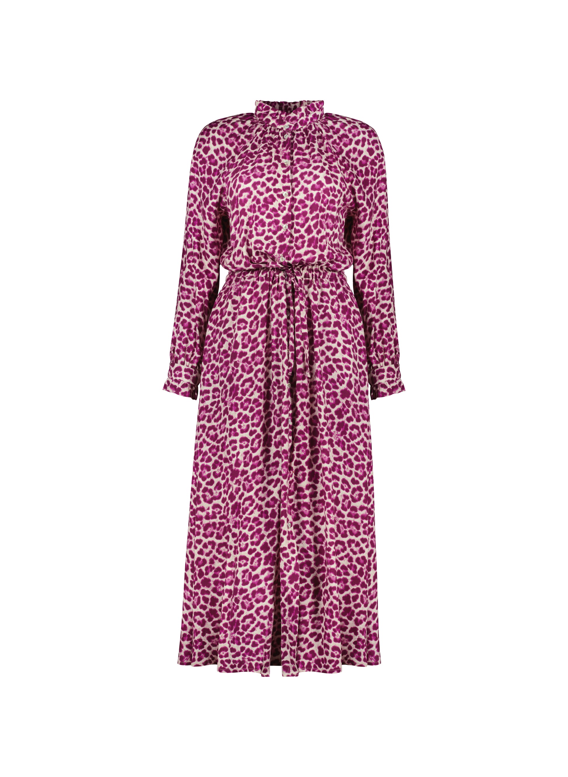 Luna is a shirt dress with all the feminine feels! Cut for a relaxed fit throughout, its raglan sleeves and gathered collar detail makes for a soft and flattering silhouette. Around the waist we’ve added an elasticated drawcord to cinch your middle. A flattering style to make a statement in, we love its vibrant pink leopard print.