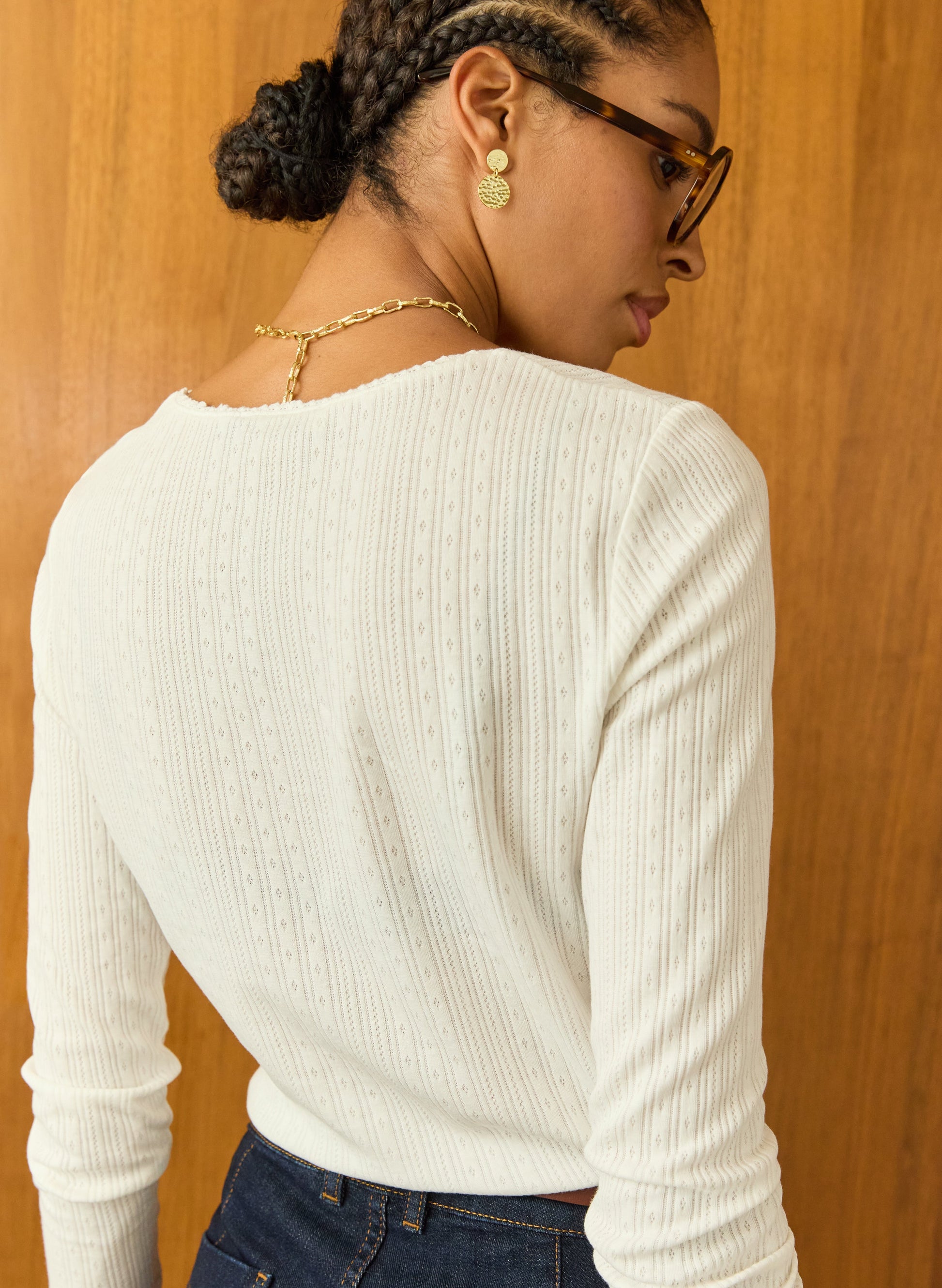 The Maeva Long Sleeve Rib Top is a slim, feelgood top that is perfect for layering. What sets it apart is how it’s crafted in soft and stretchy, organic ribbed cotton pointelle jersey. Cut to hug the body and embellished with pretty scalloped detailing around the crew neckline, it’s also great on its own with jeans.