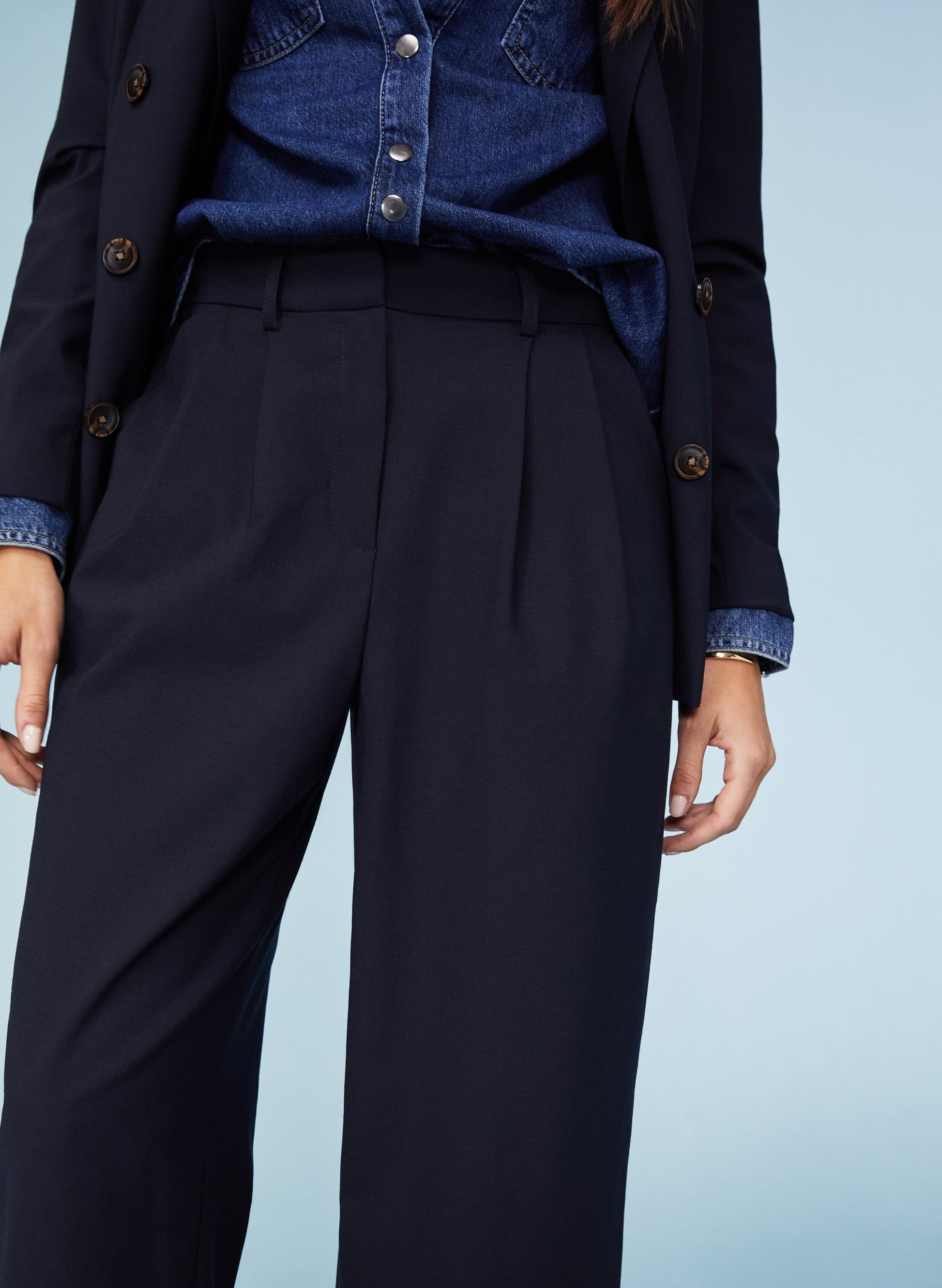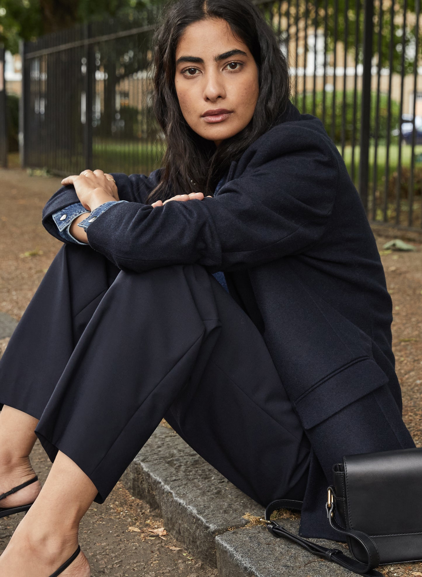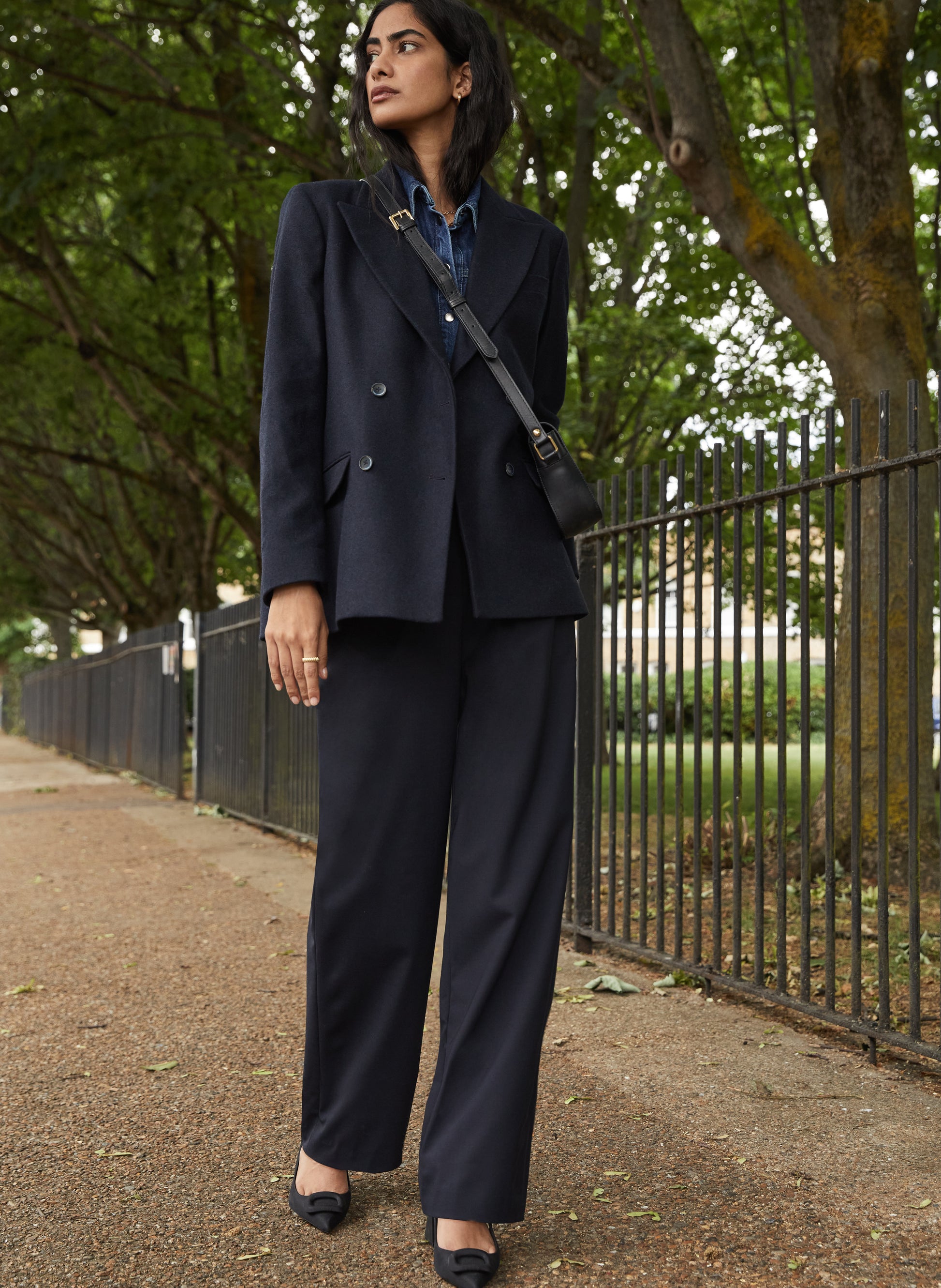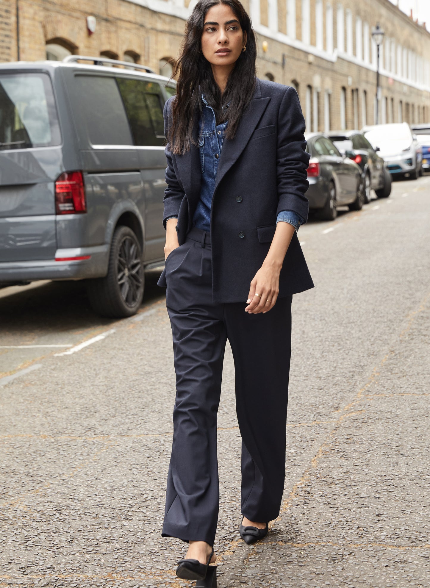 Wide-leg trousers aren't going anywhere, so we've created a tailored style in versatile, classic navy. This borrowed-from-the-boys style is made using fabric which would otherwise go to waste, and cut with a pleated front. Style them with a little black top and trainers, or with the matching Vanity Blazer and heels for head-to-toe co-ordination.