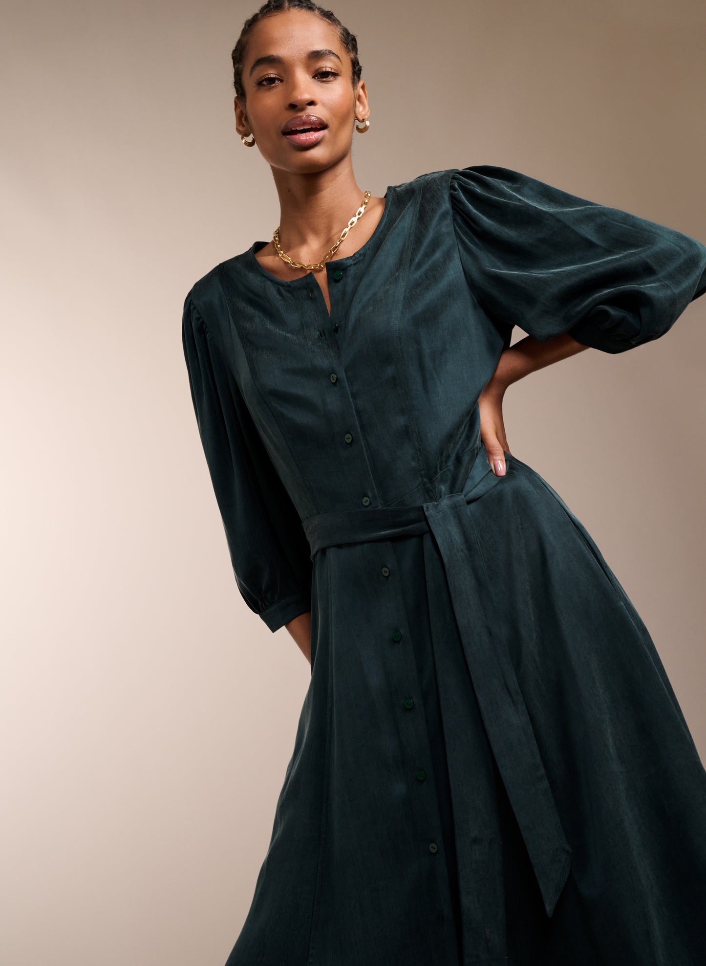 Whether it’s for brunch or work, you’ll feel ready for anything in Malin. This midi in recycled Cupro feels silky against the skin, and boasts a soft sheen in gorgeous green. It buttons all the way through and skims the waist to flatter. Tie with the self belt or a contrasting leather. It goes effortlessly with knee-high boots, loafers or mary-janes.