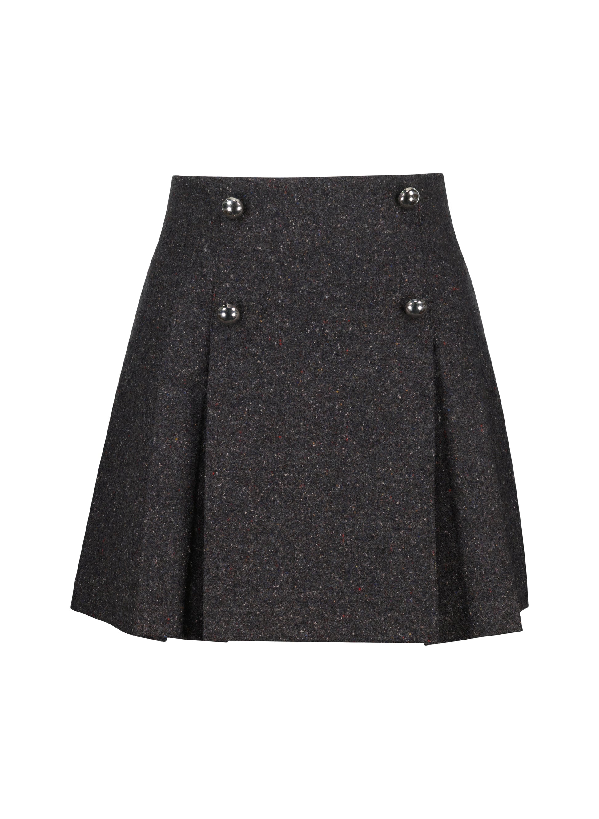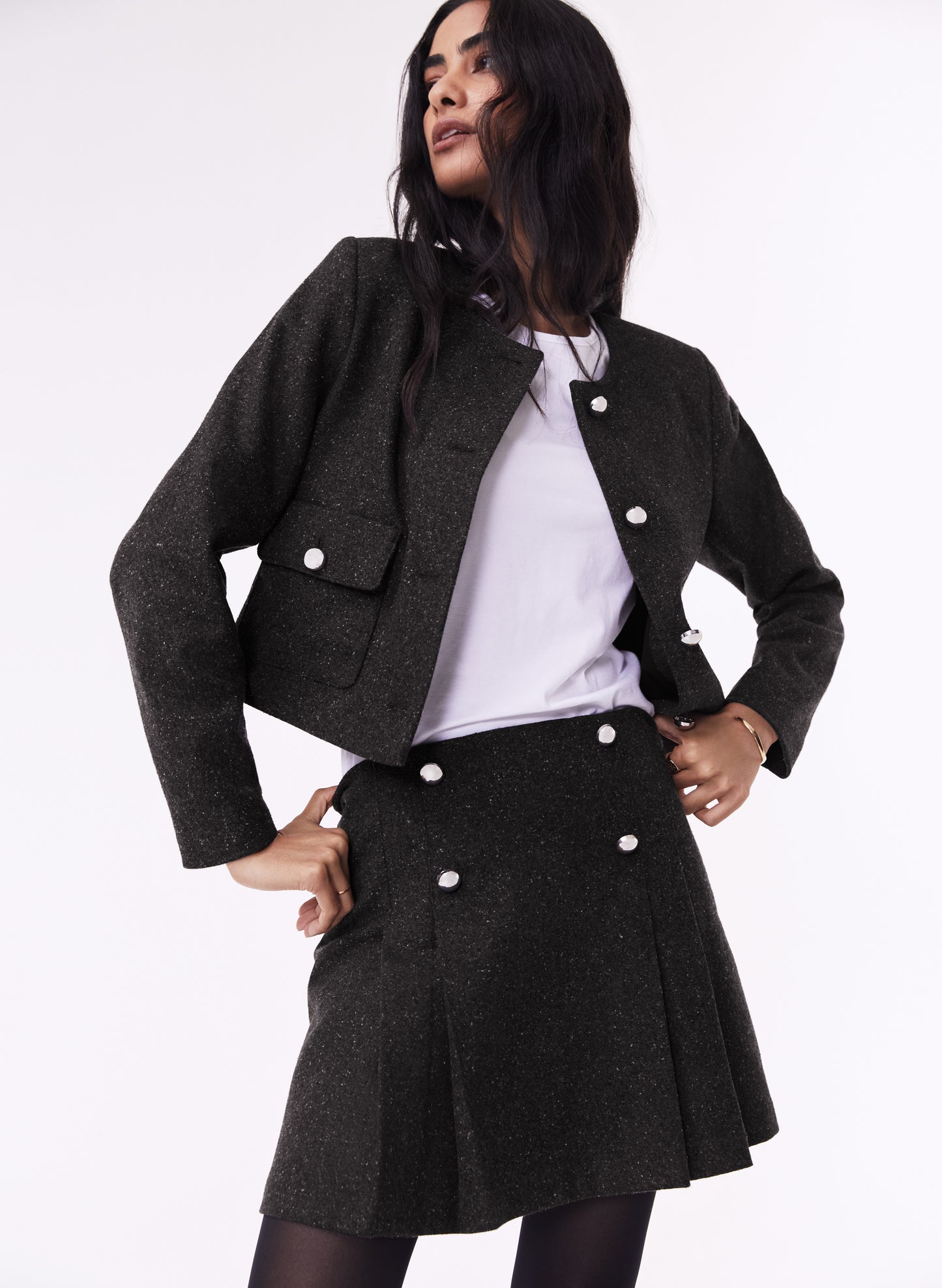 We took inspiration from traditional kilts to create this extra-special mini skirt. Marianna features pleats and domed silver buttons and is composed of recycled wool with flecks of tweed for party-ready appeal. Dress it down with a Breton top and trainers, or go all-out with the matching Anjeli Jacket.