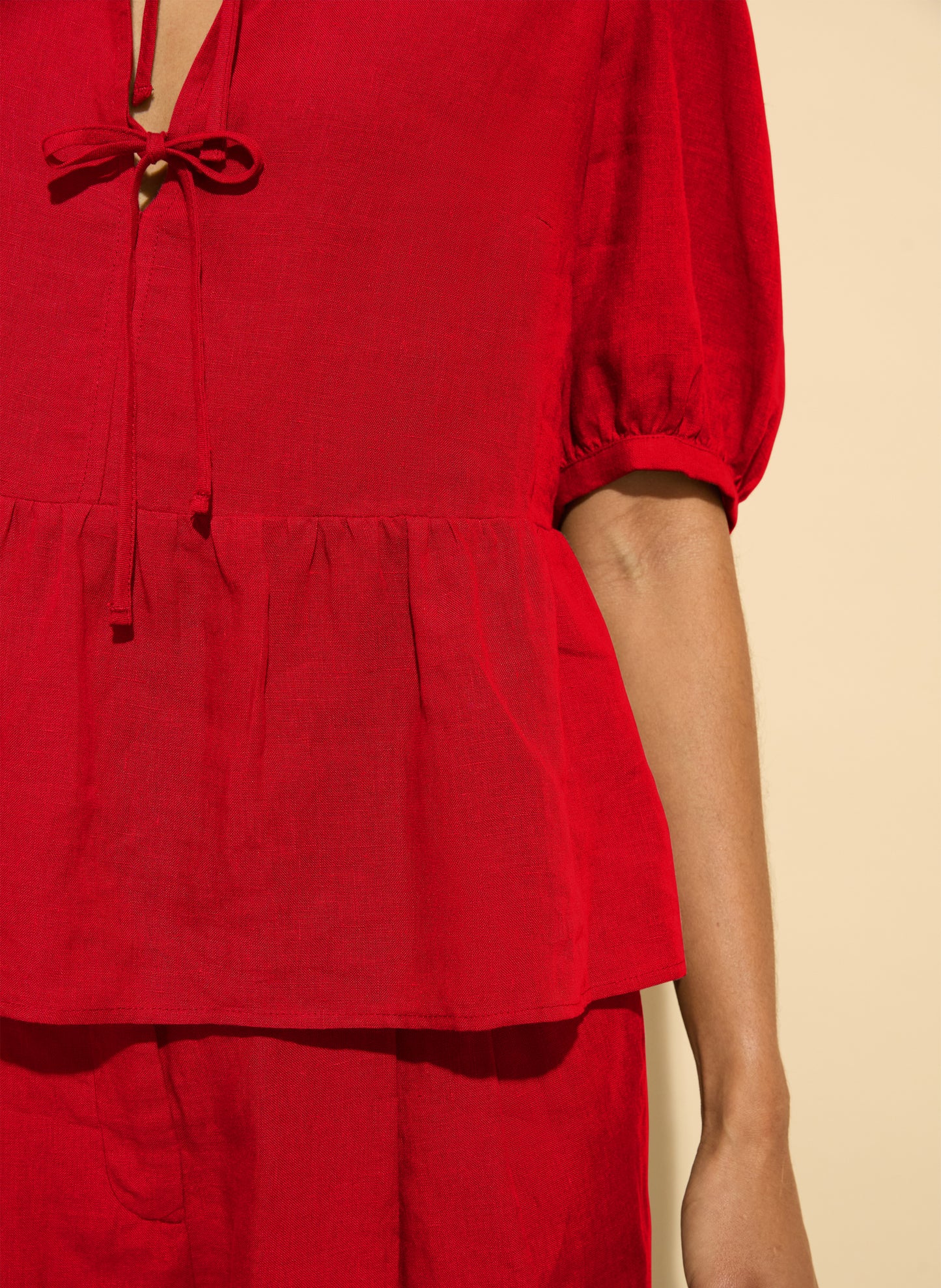 The Marylinn Blouse does everything for you - just add jeans or trousers and you’re all set! This pretty style in crimson linen features a pair of front ties (which you can fasten into bows or leave open), a loose peplum hem, and puffed sleeves for added drama. Wear with white denim, or for a top-to-toe linen outfit – the co-ordinating Melissa Linen Trousers.