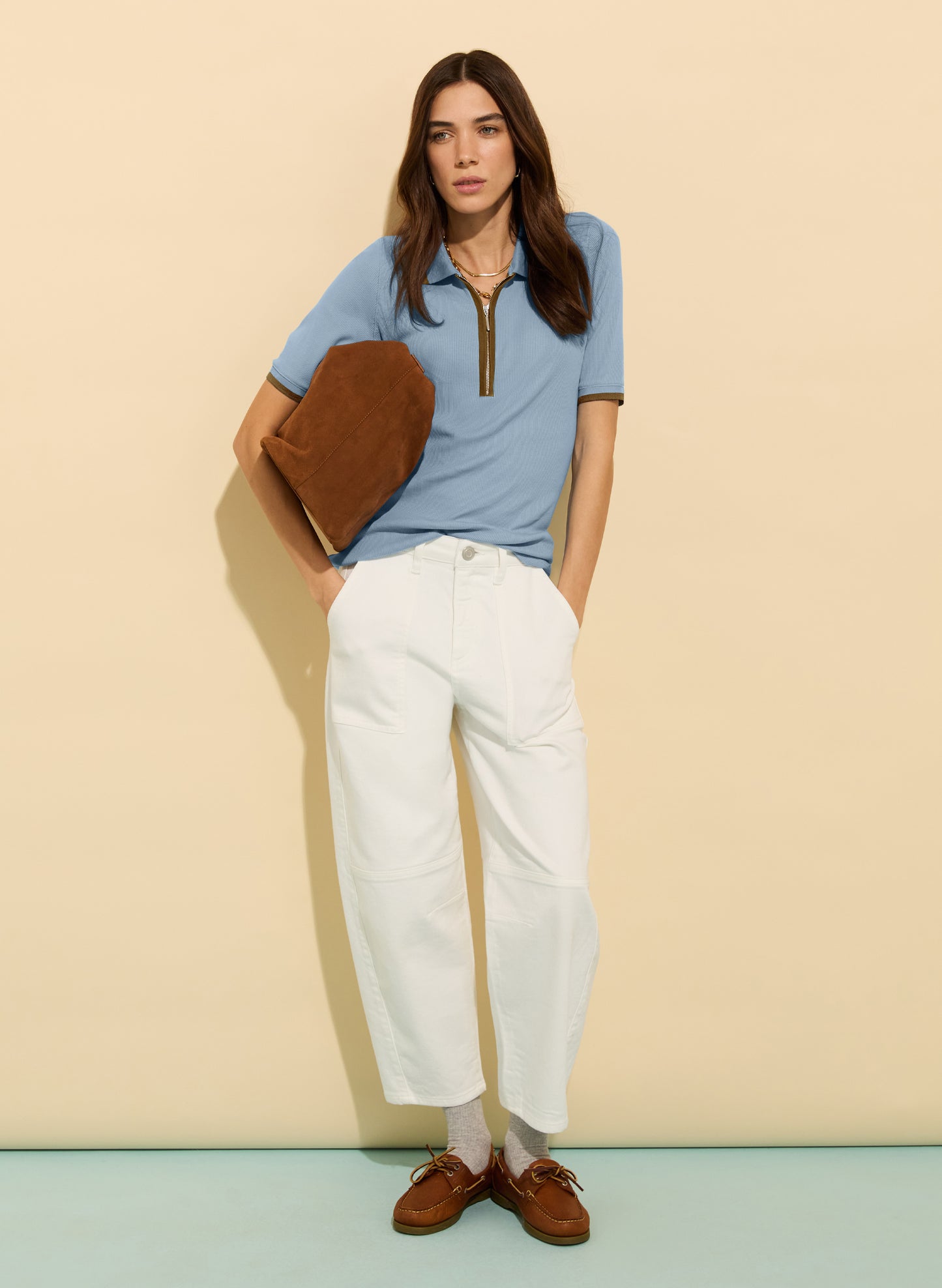 It’s not a polo nor a tee… the Naomi Rib Zip Collar Top is in a league of its own! This playful style in fresh blue features a contrast collar, placket, and cuffs in a desirable shade of brown for a subtle retro nod. Cut for a neat fit in organic cotton rib jersey, it will instantly update your favourite jeans and trousers.