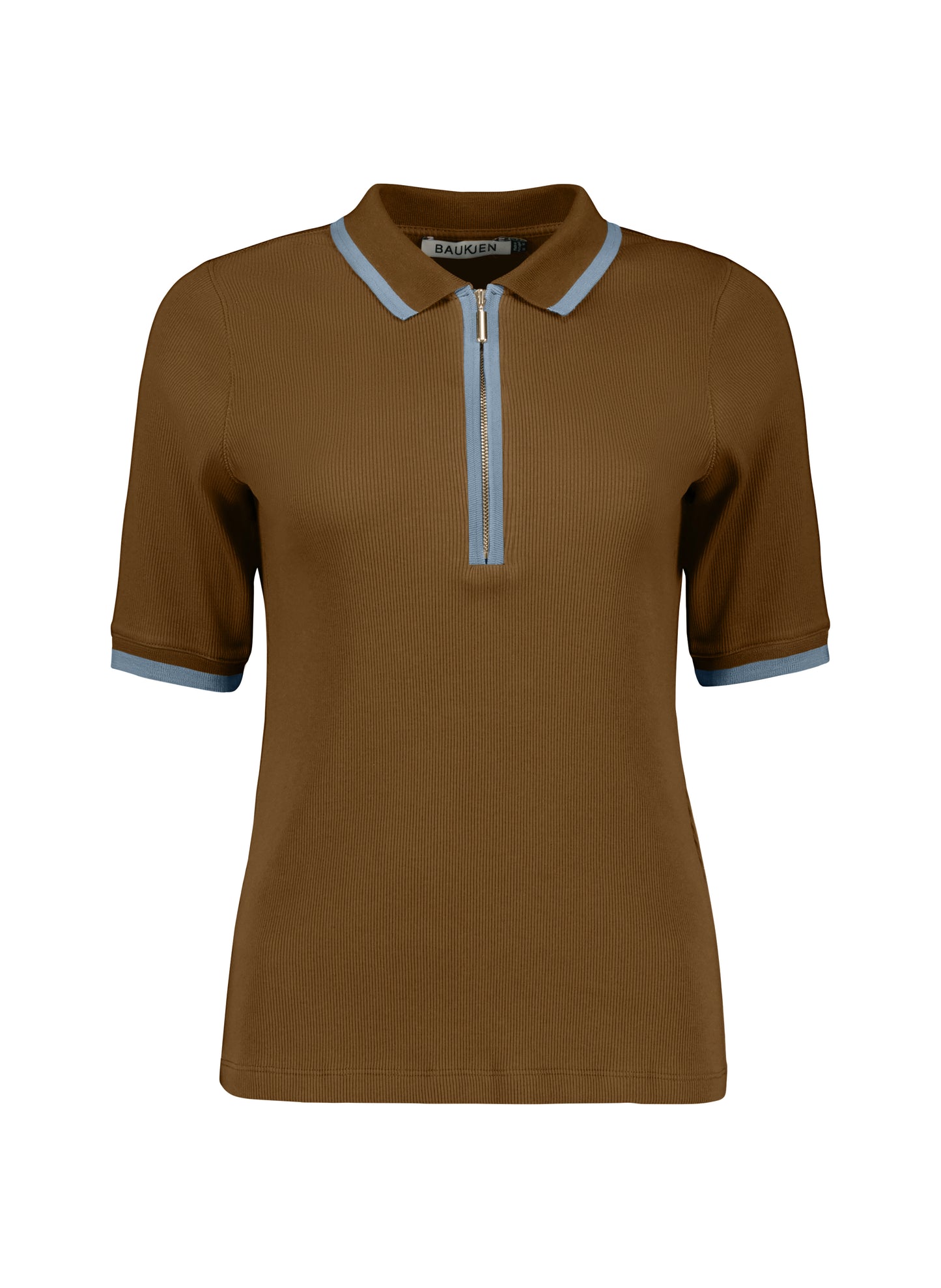 Feel comfortable while looking great in the Naomi Rib Zip Collar Top. This playful style in chocolate brown features a contrast collar, placket, and cuffs in a fresh shade of blue for a subtle retro nod. Cut for a neat fit in organic cotton rib jersey, it will instantly update your favourite jeans and trousers.