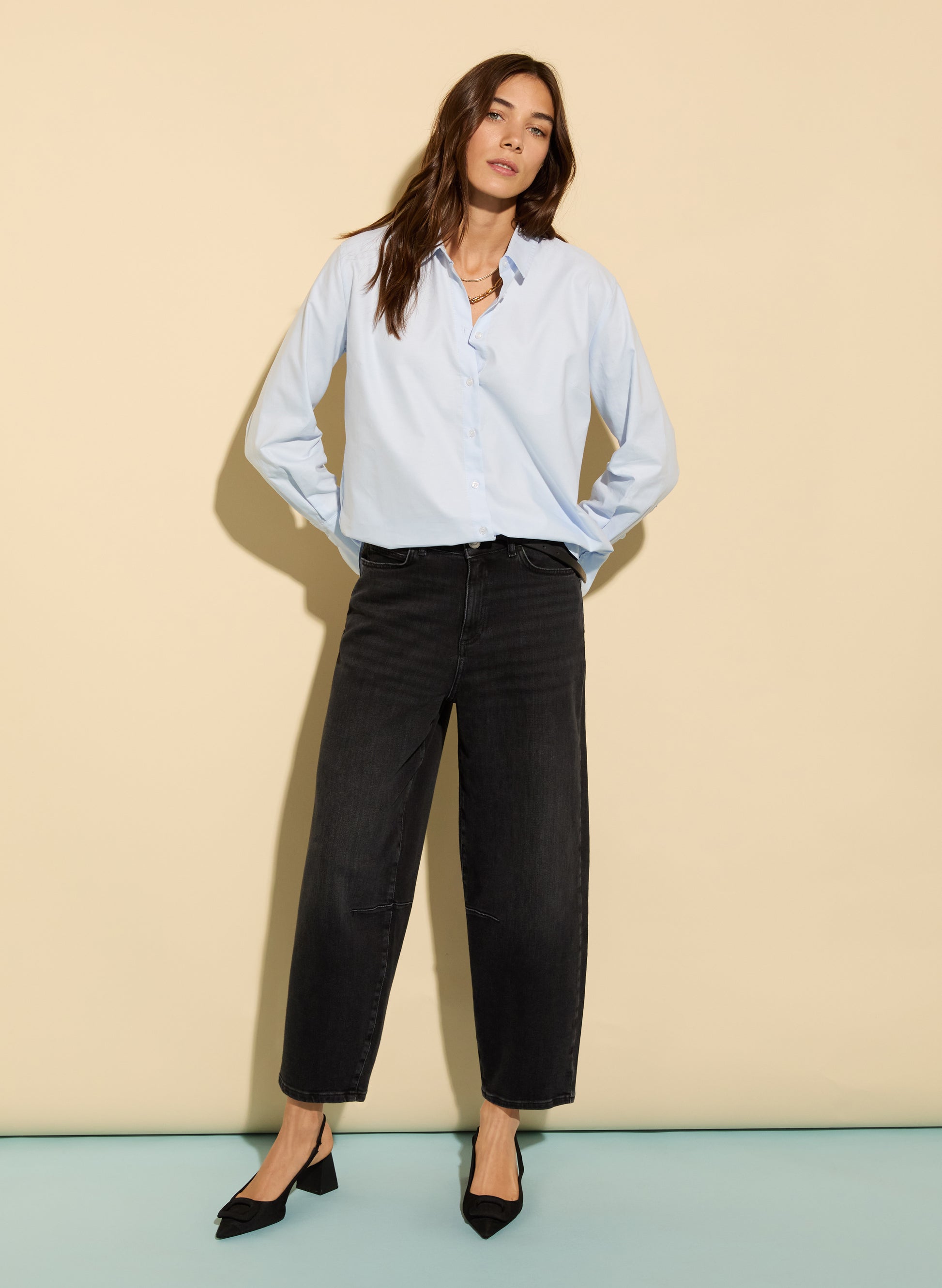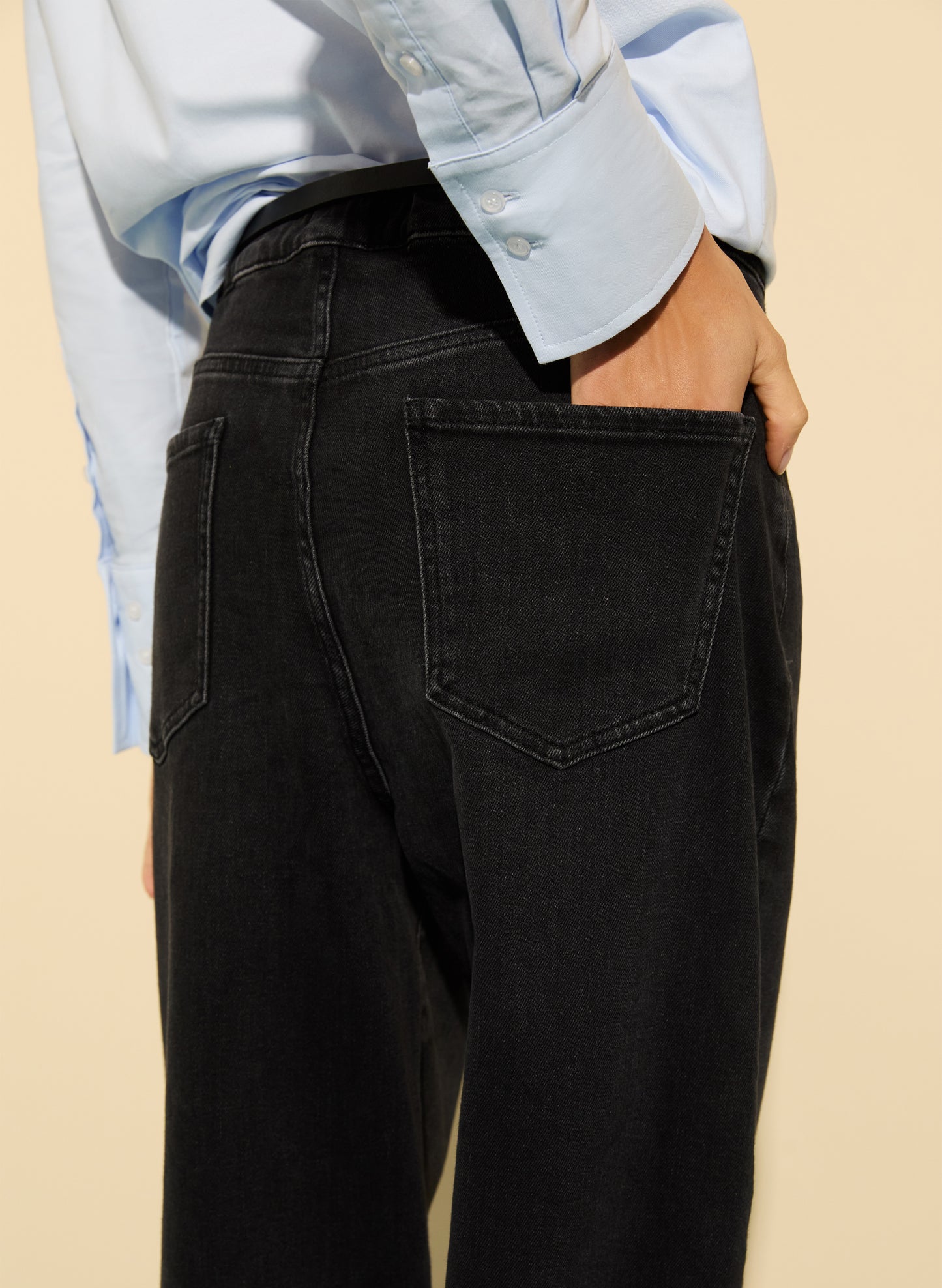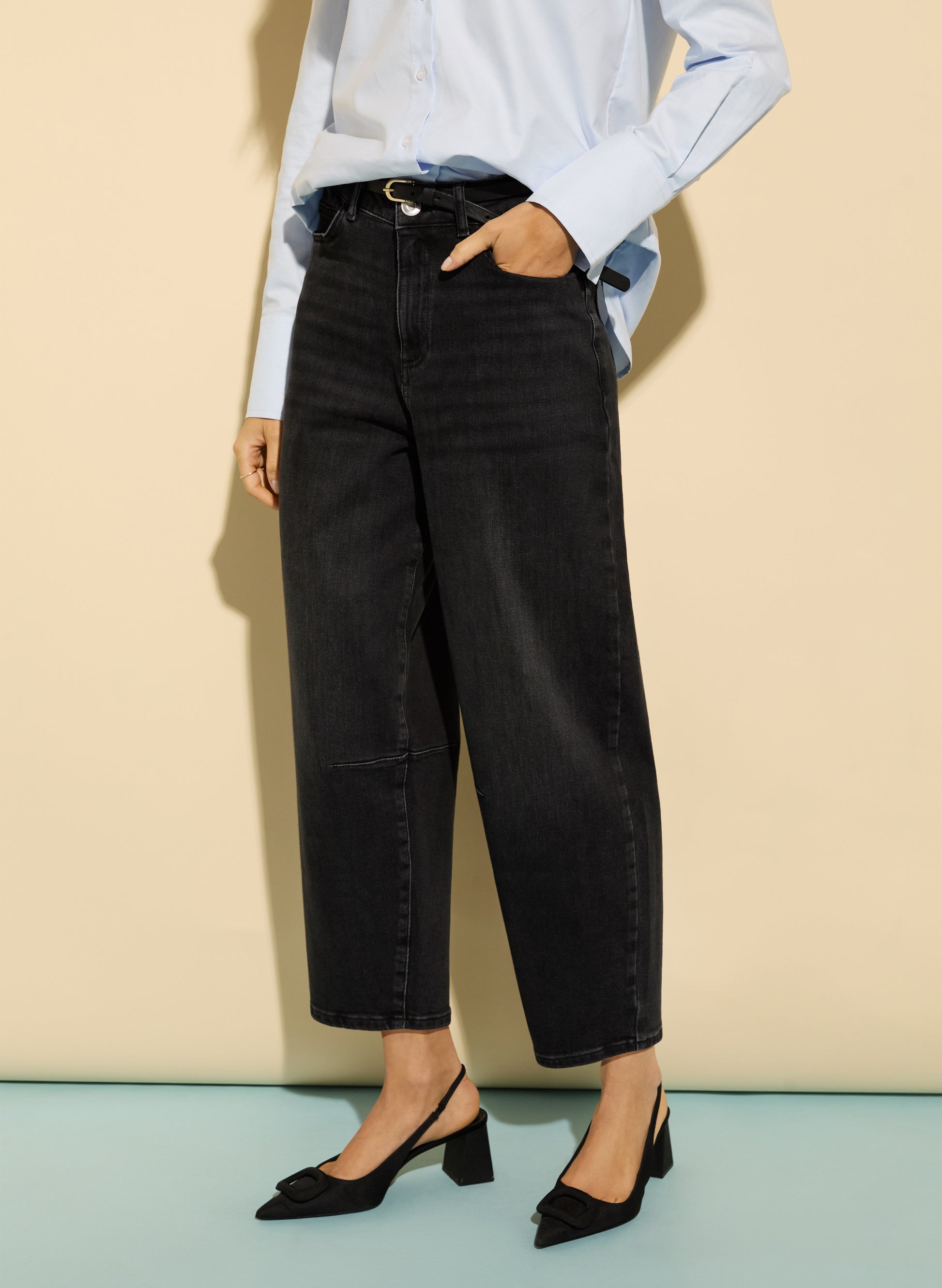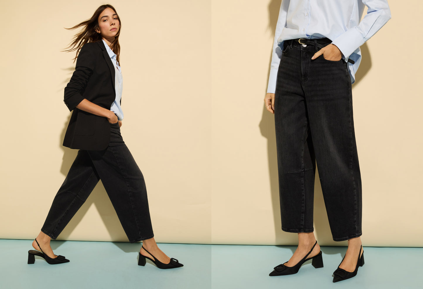 The new shape to know in sculpted denim is the horseshoe, so-called because they curve out from the hips before tapering in at the ankle. If you like roomy, cropped denim, then give them a go with a tight-fitting top. We love this distinctive and contemporary silhouette and have made them even more comfortable by adding an elastic panel to the back of the waistband for optimum movement.
