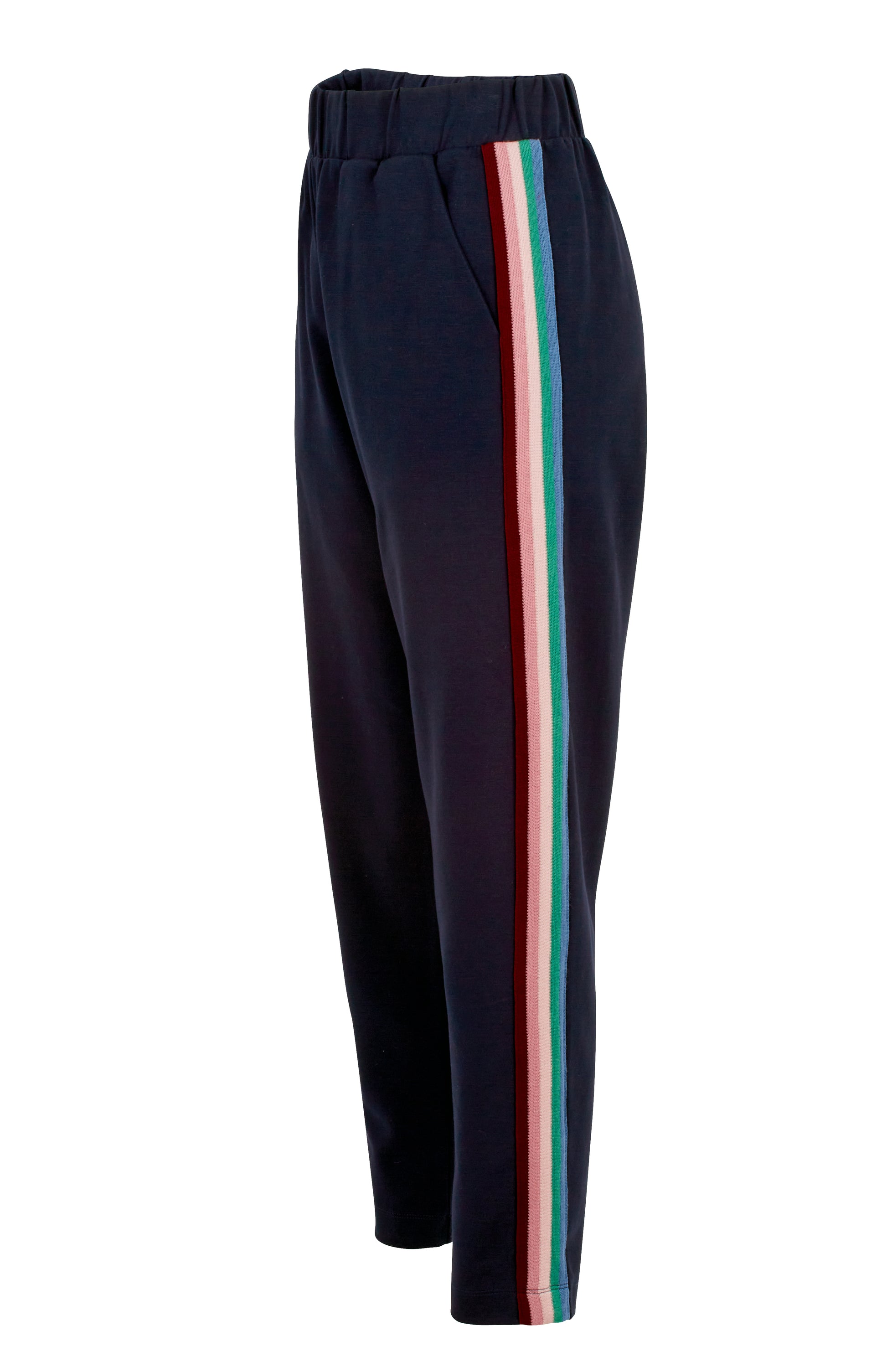 These pants have spread so much joy since they launched last season that they’re back, this time in dark colourways with a bold, rainbow knitted side stripe. Crafted in Ponte with recycled fibres and LENZING™ ECOVERO™, they come with an elasticated waistband and a tapered leg.