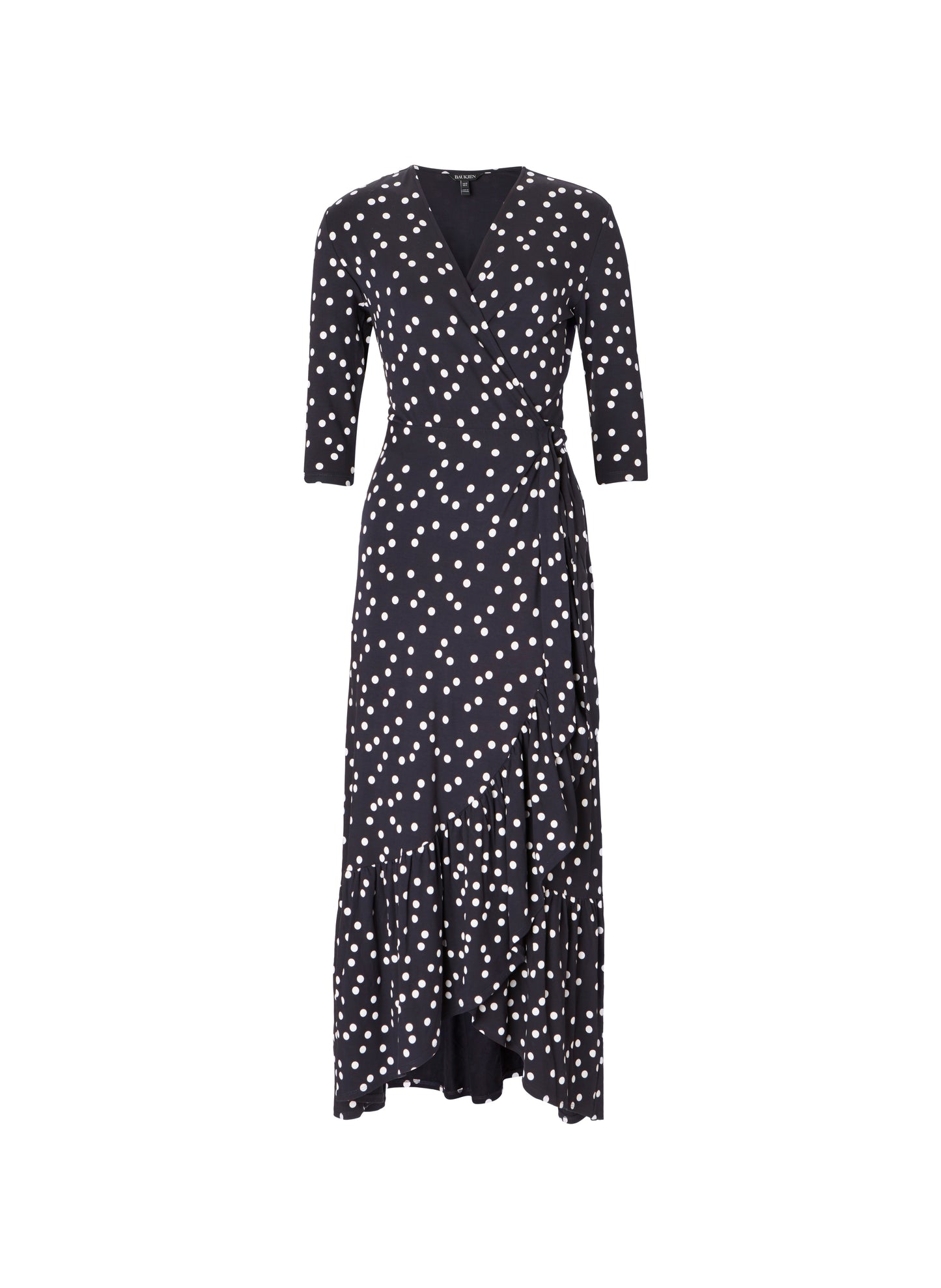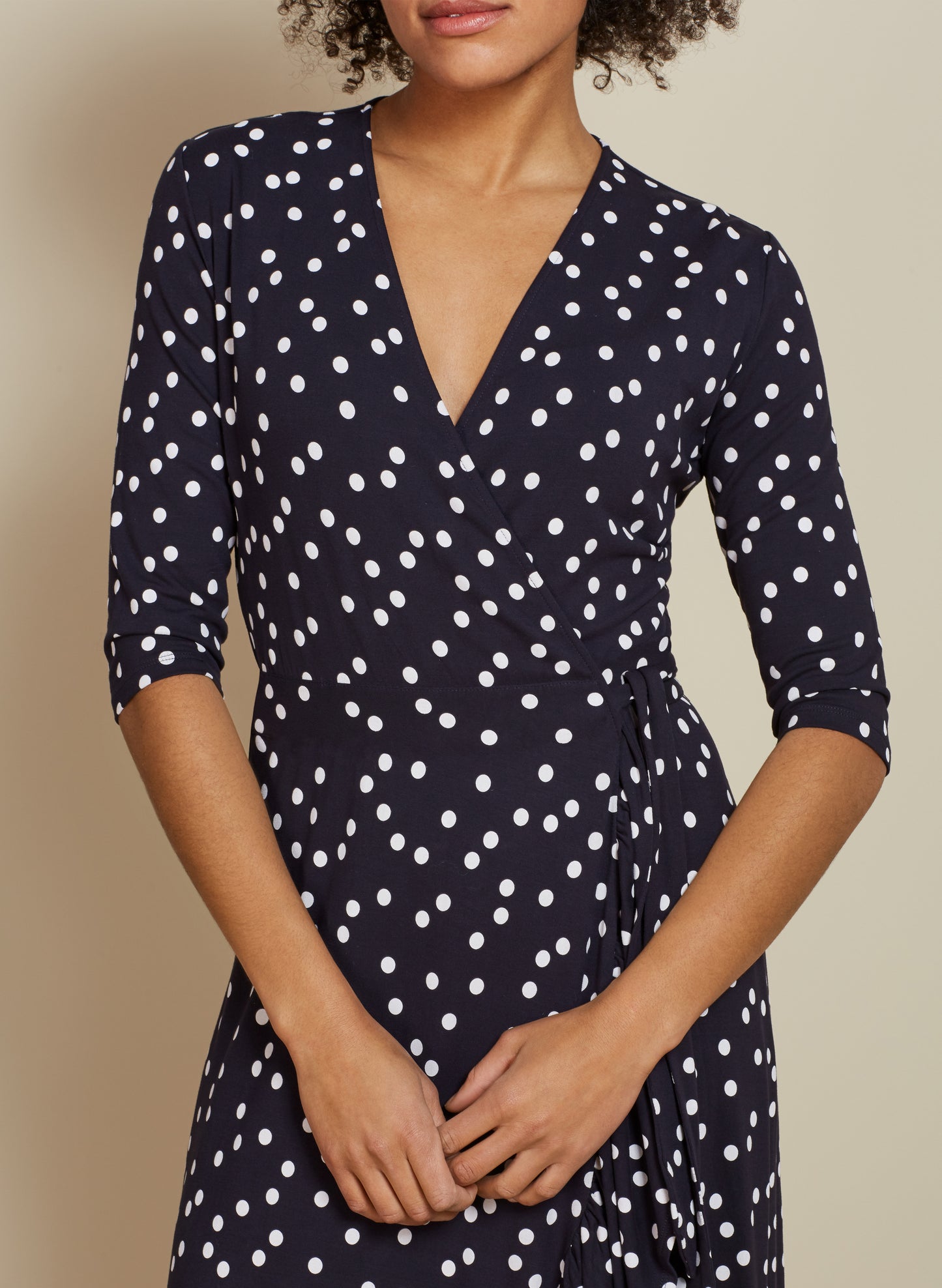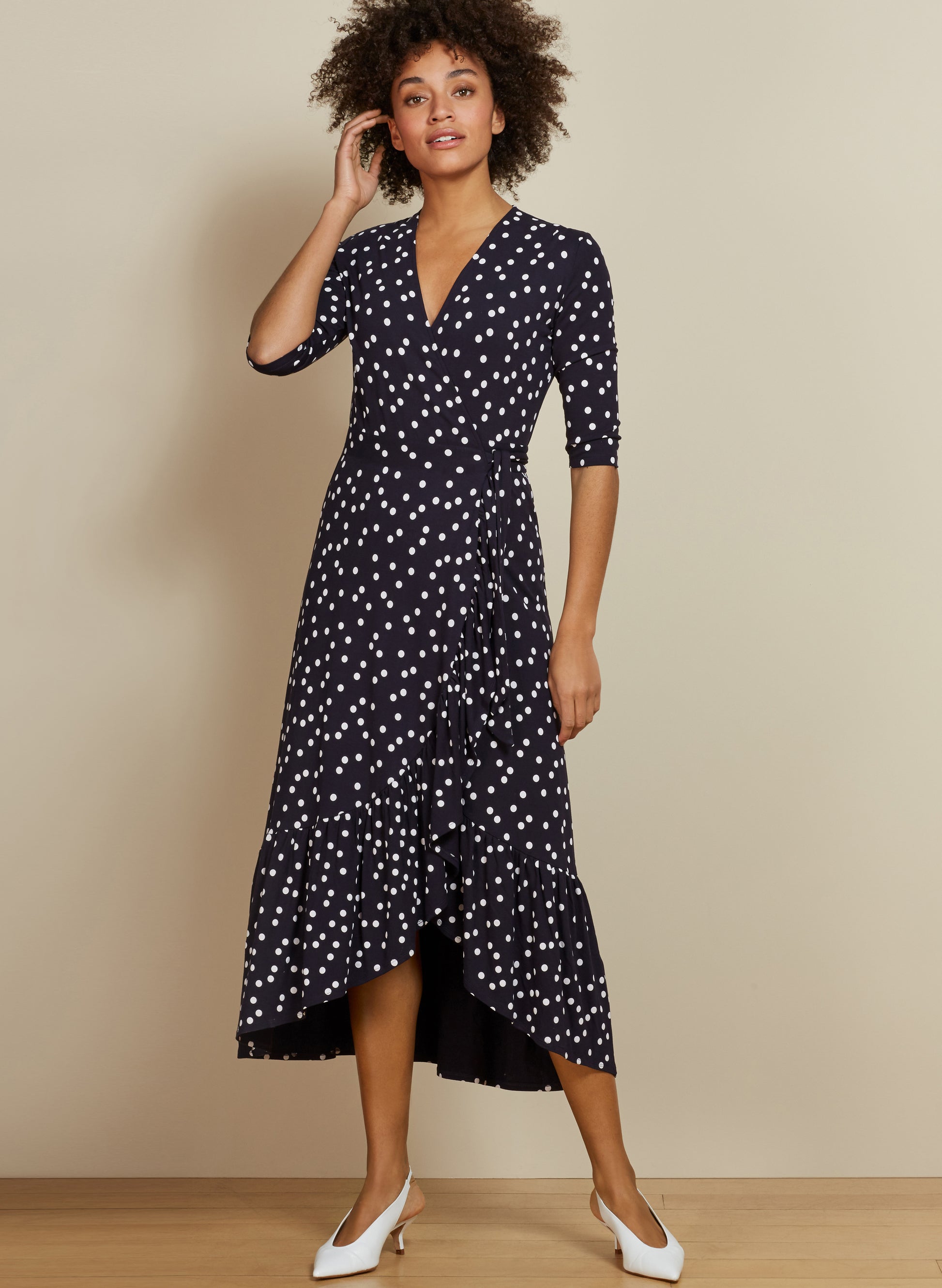 Meet the Sapphire Ruffle Dress – the dress that covers all occasions. The generous ruffle detail along the hem gives a playful yet elegant edge to your look. The navy and white polka jersey offers an air of sophistication, and the functional wrap design makes for completely effortless dressing. One to wear on repeat for years to come.