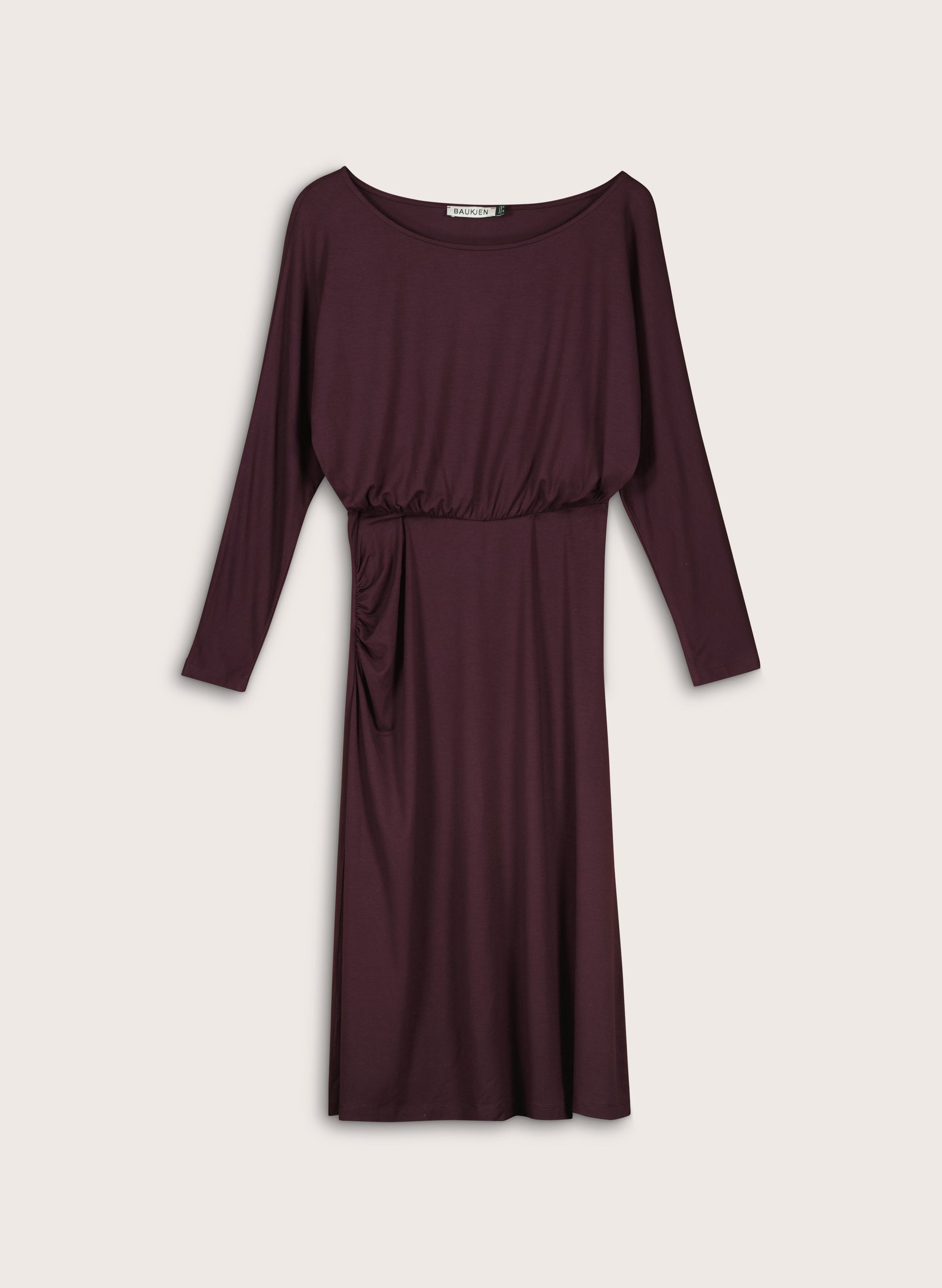 Our Sarah Midi Dress is proof that you can look elegant while feeling comfortable. Crafted in our signature stretchy jersey, this style simply pulls on and comes in a deep shade of plum. It’s cut for a drapey fit with batwing sleeves and an off-the-shoulder neckline before cinching around the waist and hips. The skirt then flares out, making for a feelgood, versatile and low-maintenance dress.