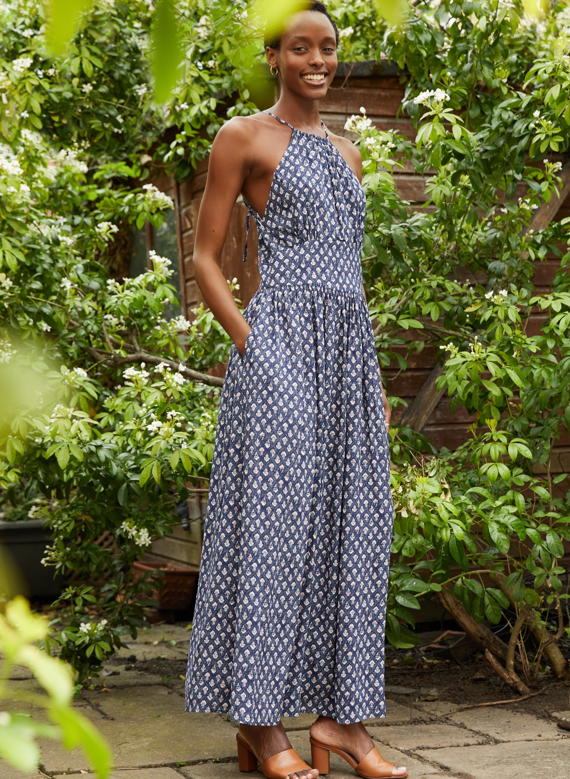 A word of warning: beautiful Sarai will quickly become your new favourite summer dress! This style in floaty voile features a pretty, woodblock-inspired print and fastens around the neck for an elegant halter-style shape. Whether it’s for balmy holiday nights or garden parties, you’ll want to wear it on repeat.
