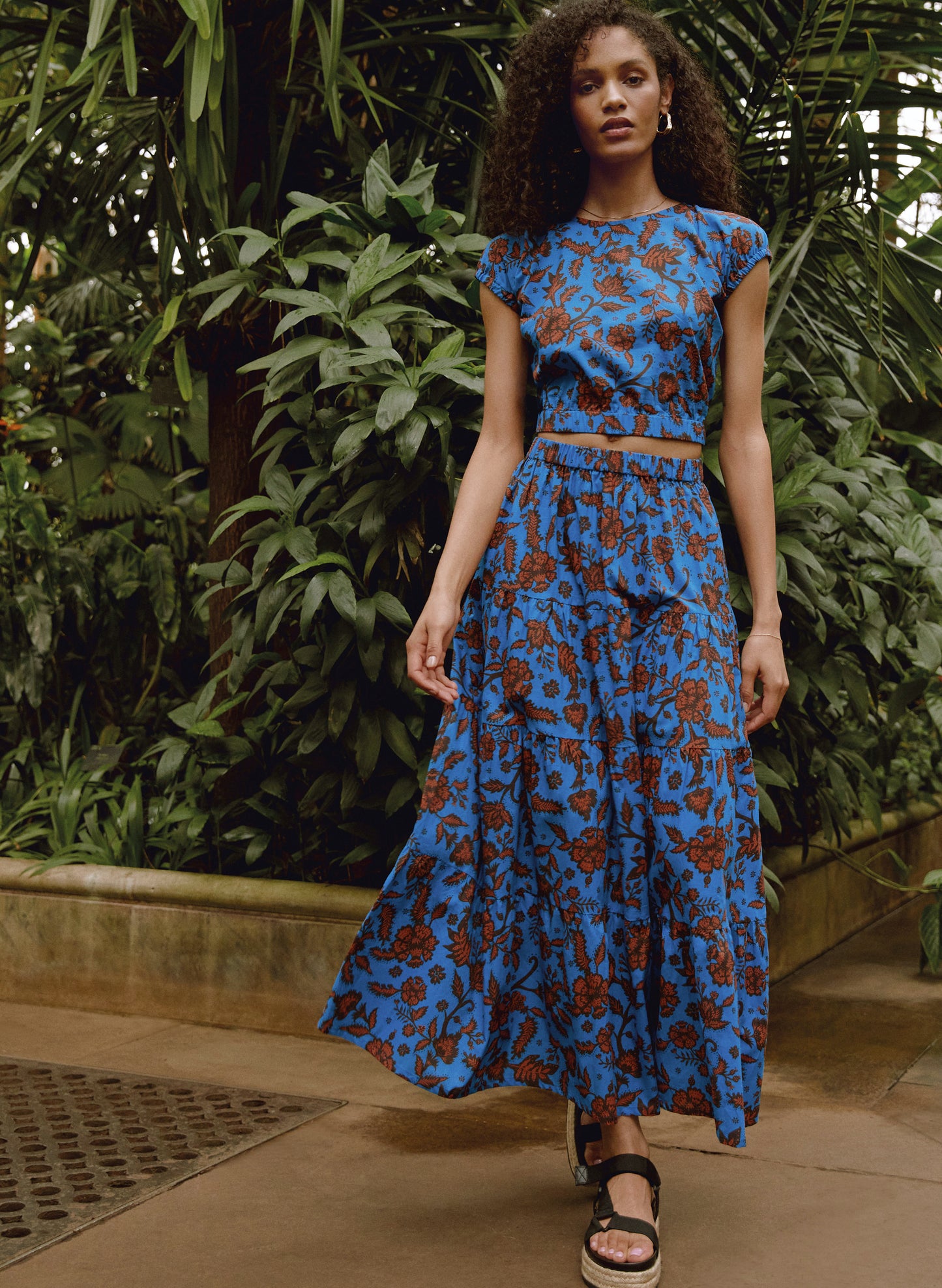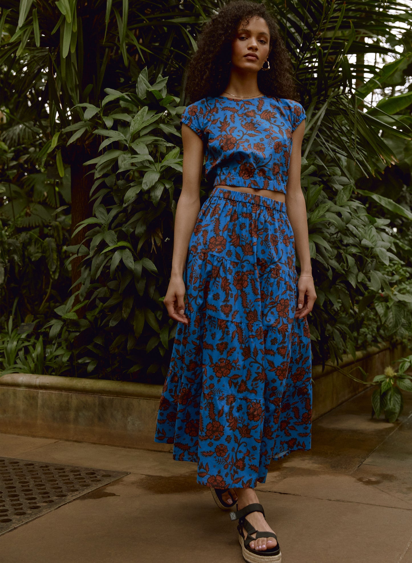 If clothes could take you places, Tammy would whizz you straight to the Amalfi coast for a hit of the Dolce Vita! Its bold azure blue and brown floral pattern is inspired by the tiles of Capri, and it comes in organic cotton for structure. Cropped to the waist, this feature is balanced out by the crew neckline and capped sleeves. Wear it with high-waisted trousers, or full-on summer glamour: with the co-ordinating Tammy Skirt.