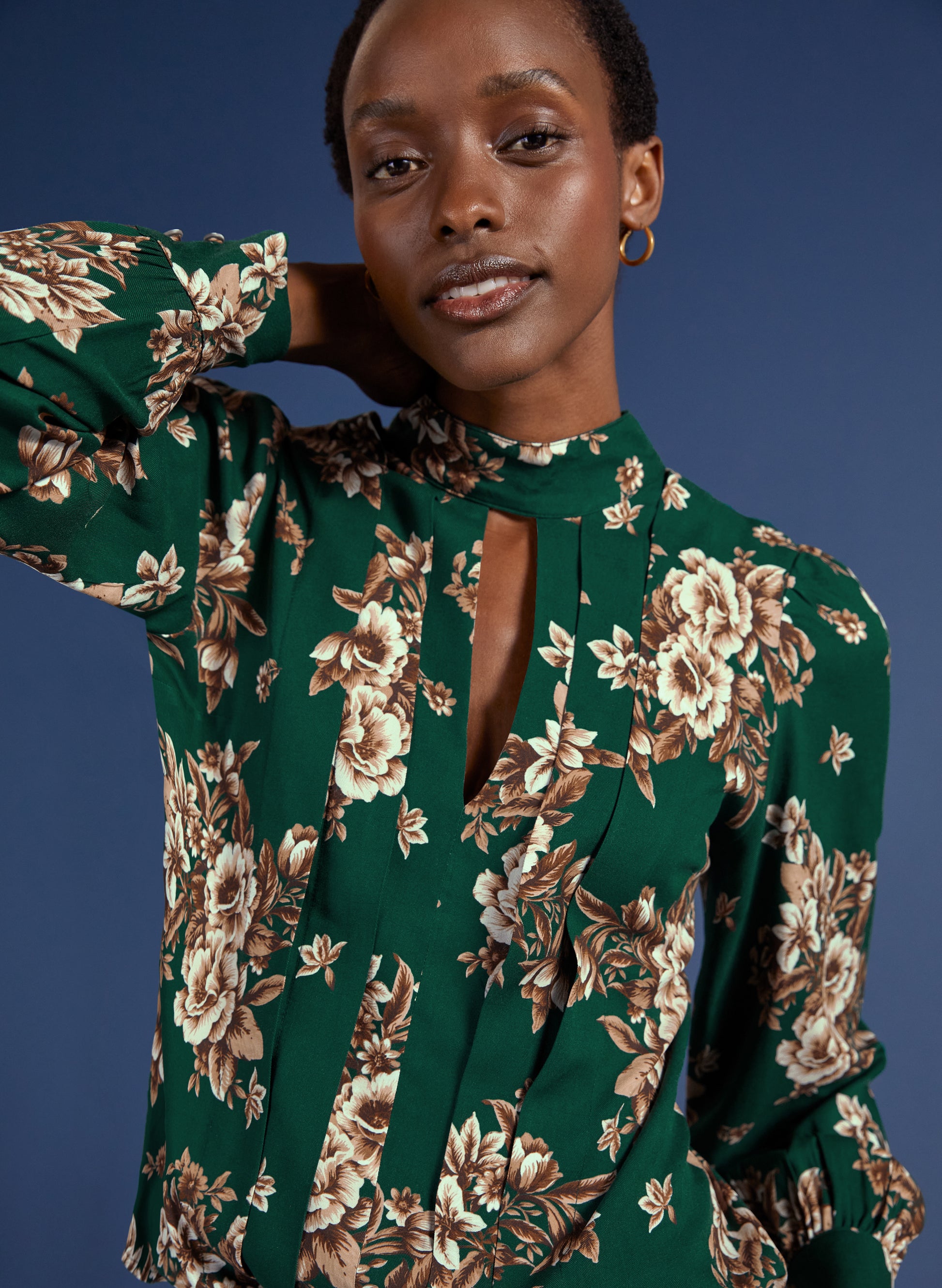 If you love our Primrose Dress then you’ll love this top. The Trinity is all about the neckline: a sophisticated pleated front features a split for a keyhole detail. This style’s bold cedar-green base is offset with a beautifully faded floral print, offering versatility tucked into indigo denim, black pants or earthy-toned leather trousers.